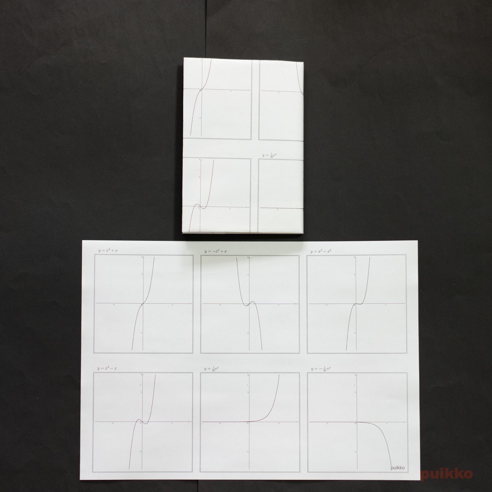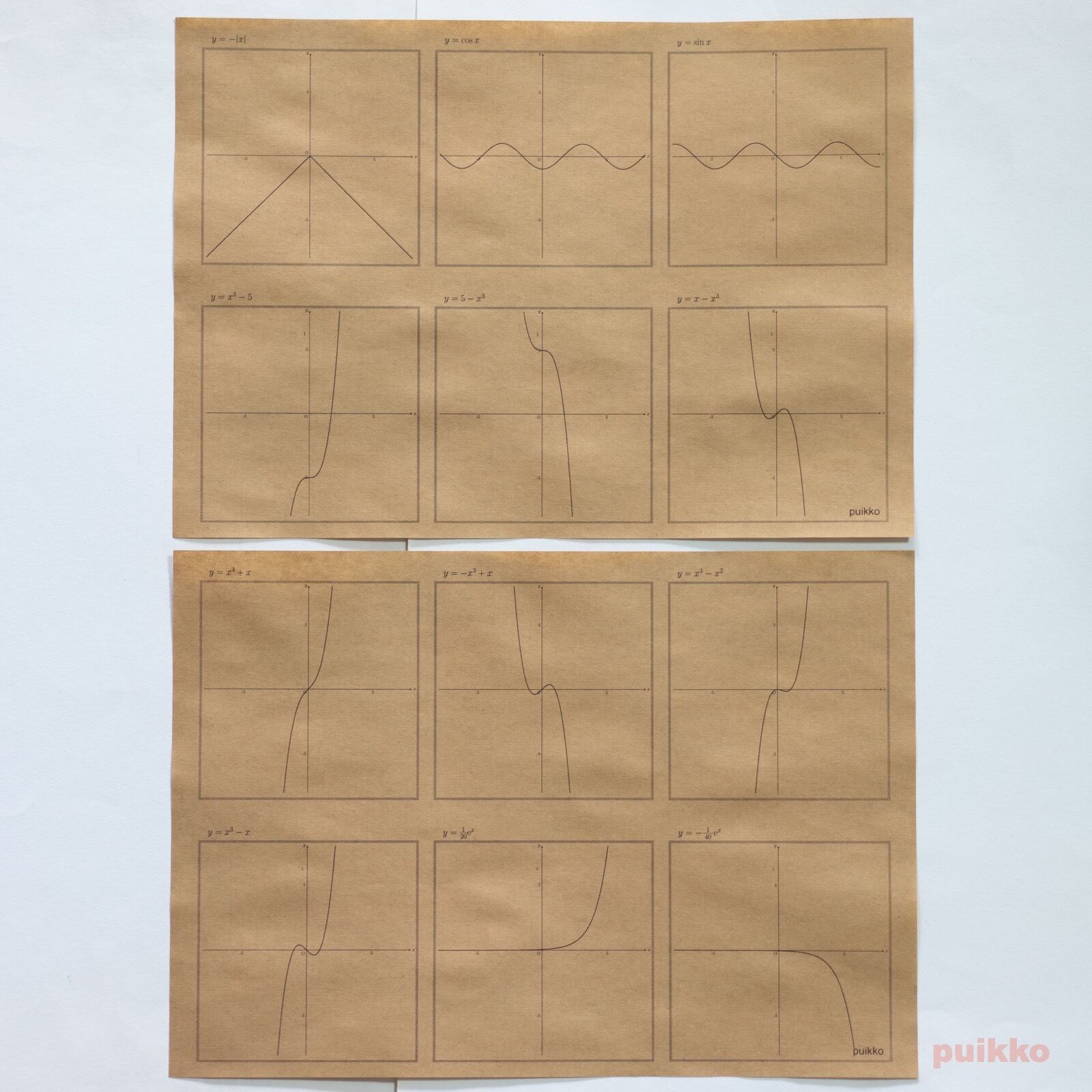 「y=x」「y=x^2」などの方程式とそのグラフ30点を1枚に6点ずつまとめてブックカバーにしました。