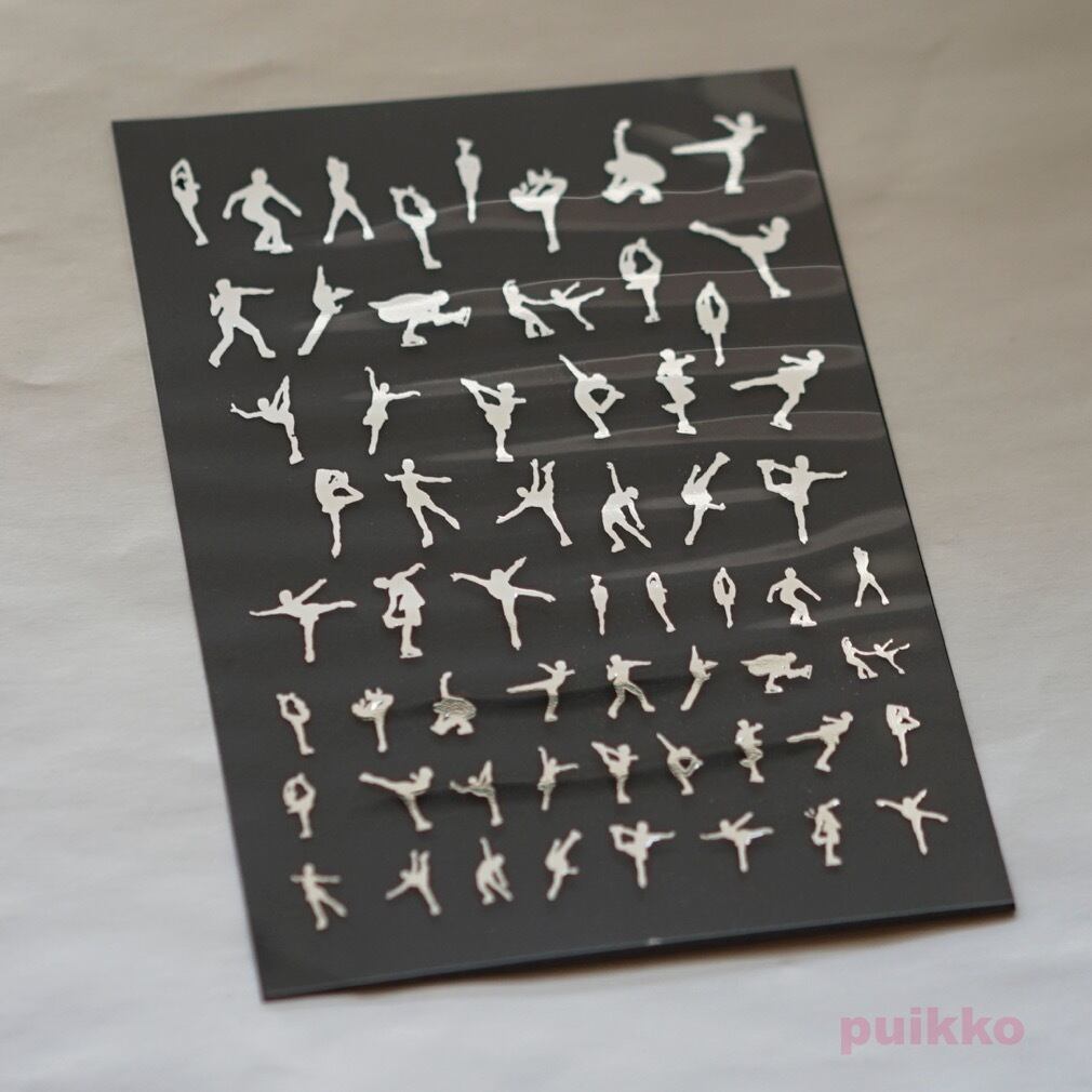 フィギュアスケートのシルエットイラストをOHPフィルムにモノクロで印刷し、金/銀の箔を押しました。