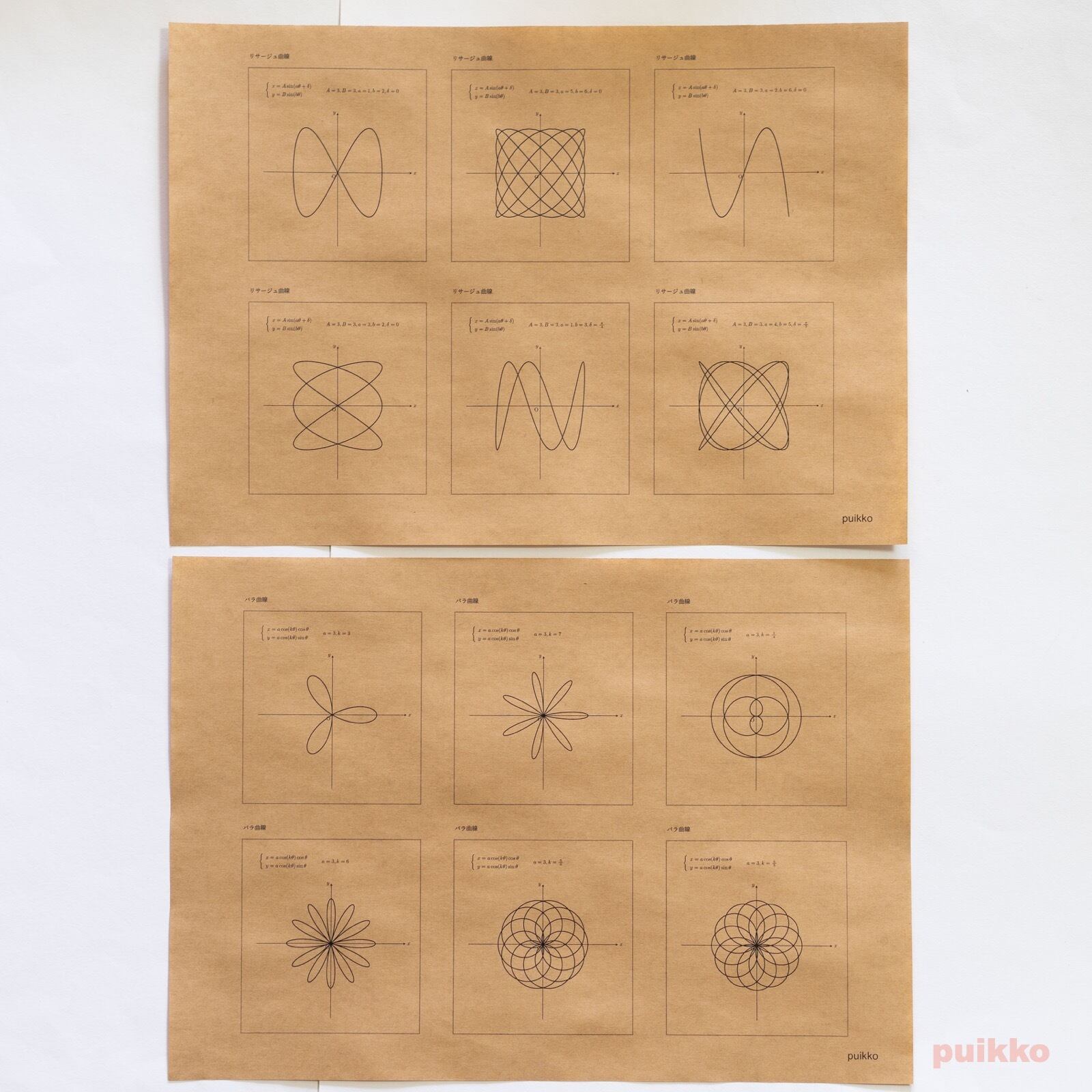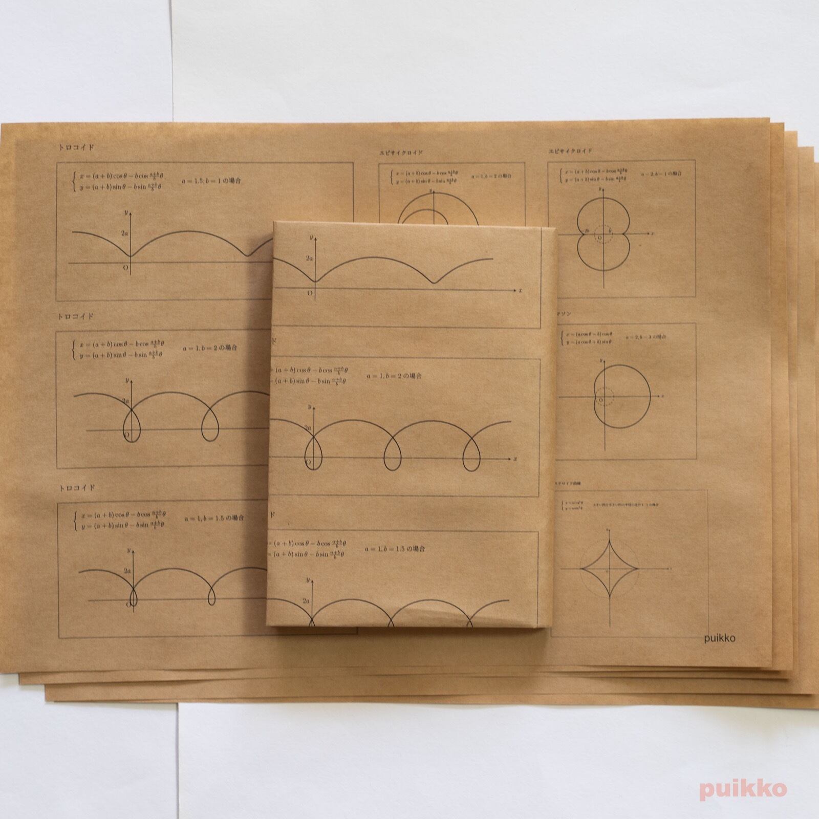 トロコイド、エピサイクロイド、リマソン、リサジュー曲線、バラ曲線などの方程式とそのグラフ33点を1枚に6点ずつ(1枚めのみ9点)まとめてブックカバーにしました。