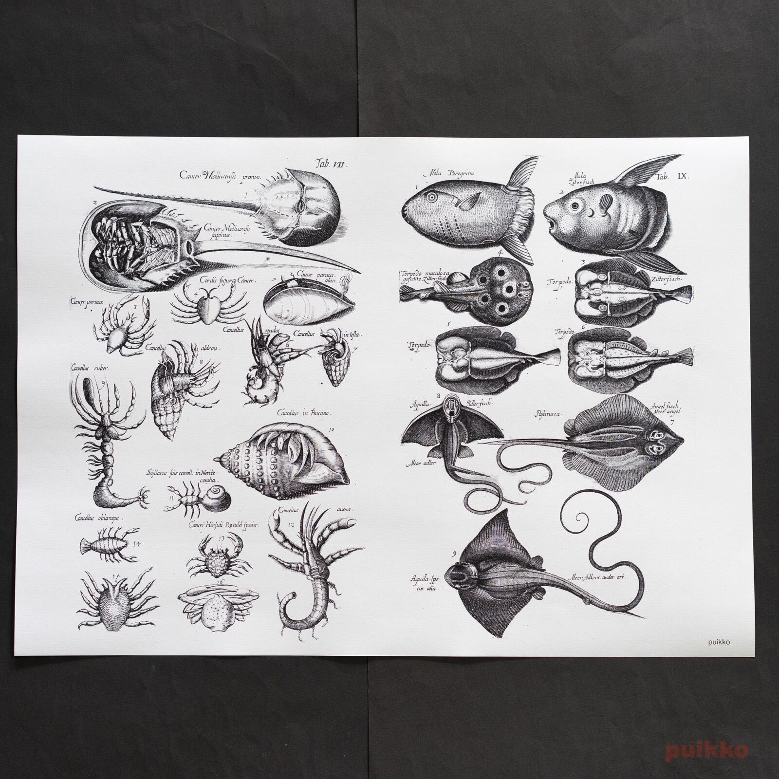 17世紀オランダの博物学者ヨハネス・ヨンストンが著した「鳥獣虫魚図譜」(Historiae Naturalis)は、獣、鳥、魚、虫など動物を銅版画で克明に描いた図鑑。全5巻にわたる図鑑のうち、Historiae Naturalis De Piscibus Et Cetis Libri V および Historiae Naturalis De Exanguibus Aquaticis Libri IV に掲載されている魚、クジラ、水生生物の図版を用いて配置しました。