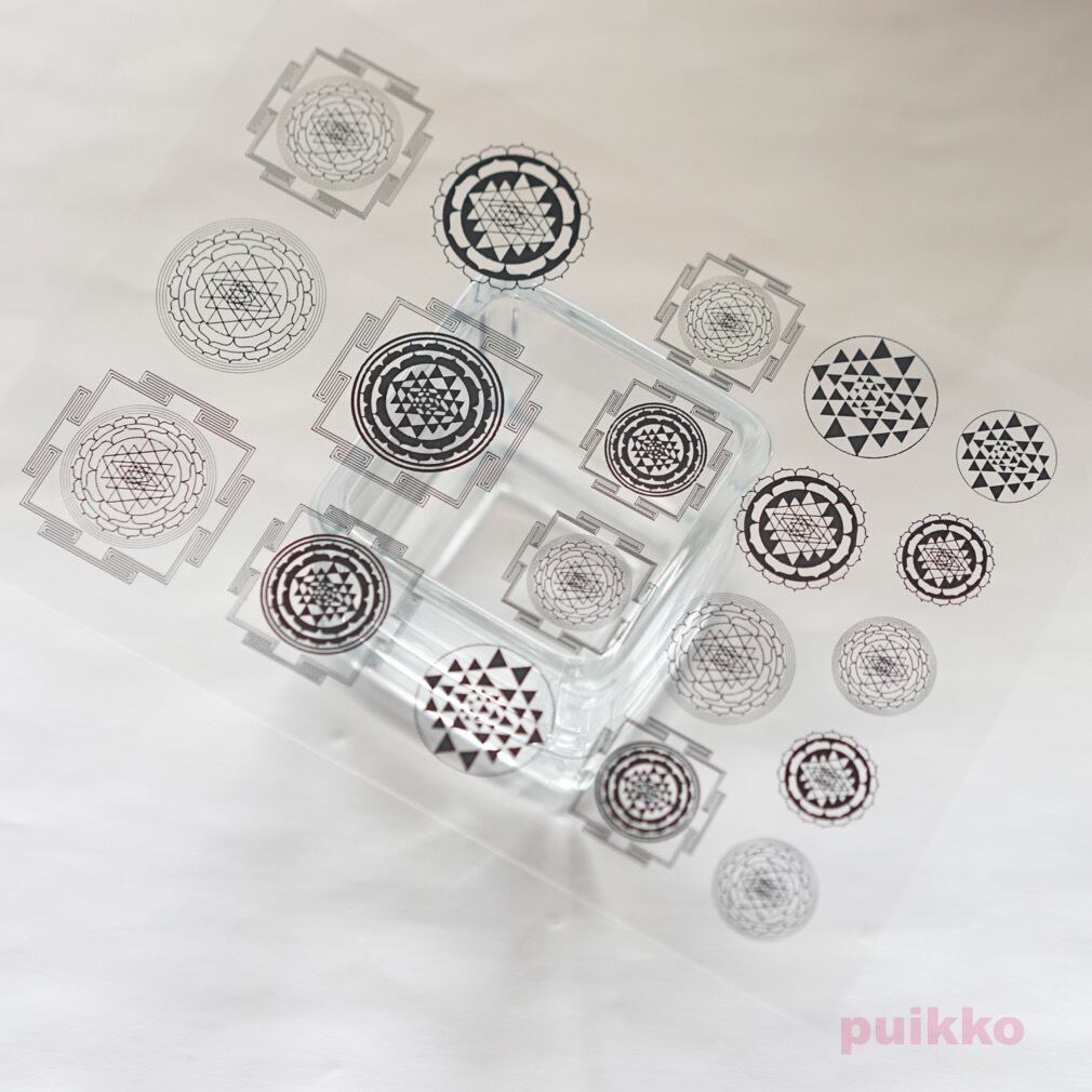 ヤントラとは、ヒンドゥー教徒、とくにタントリズムに行ずる人々が瞑想の補助具として用いる象徴的幾何学図形による図像。チャクラを解放し強化するものとして用いられています。その中でも代表的なものがシュリ・タントラ。宇宙と生命の原理を表す神秘的な図形です。