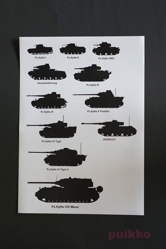 極秘裏に開発されたI号戦車からティーガー、パンター、超重戦車マウスまで、以下の11種のドイツ戦車のシルエットを収録しました。
