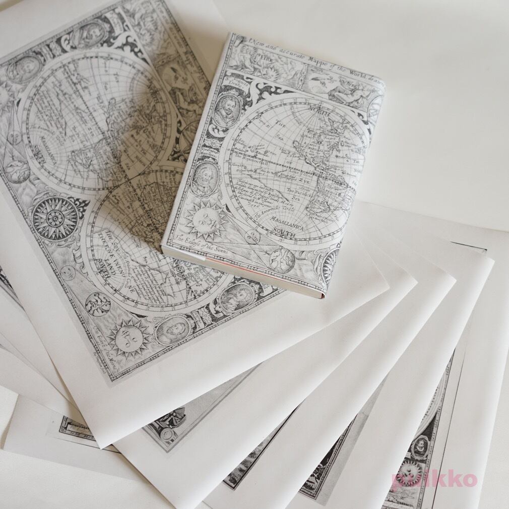 17世紀の世界地図をもとにモノクロ印刷しました。周囲に余白がありますが、文庫本用に天地左右を折ったときにちょうど余白が隠れるサイズとなっています。