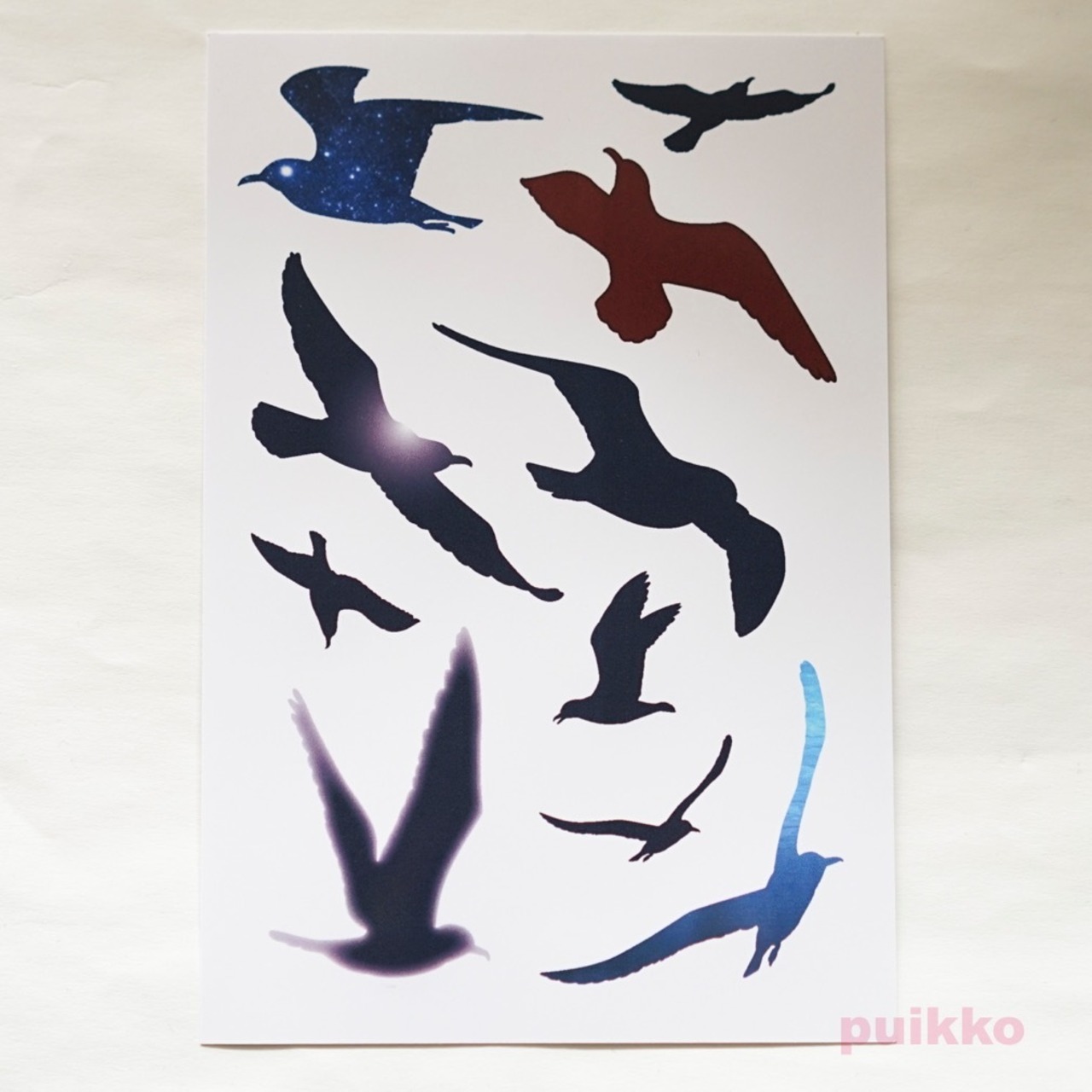 はばたくカモメのシルエット図柄10点をサイズ違いでまとめた転写タトゥーシールです。