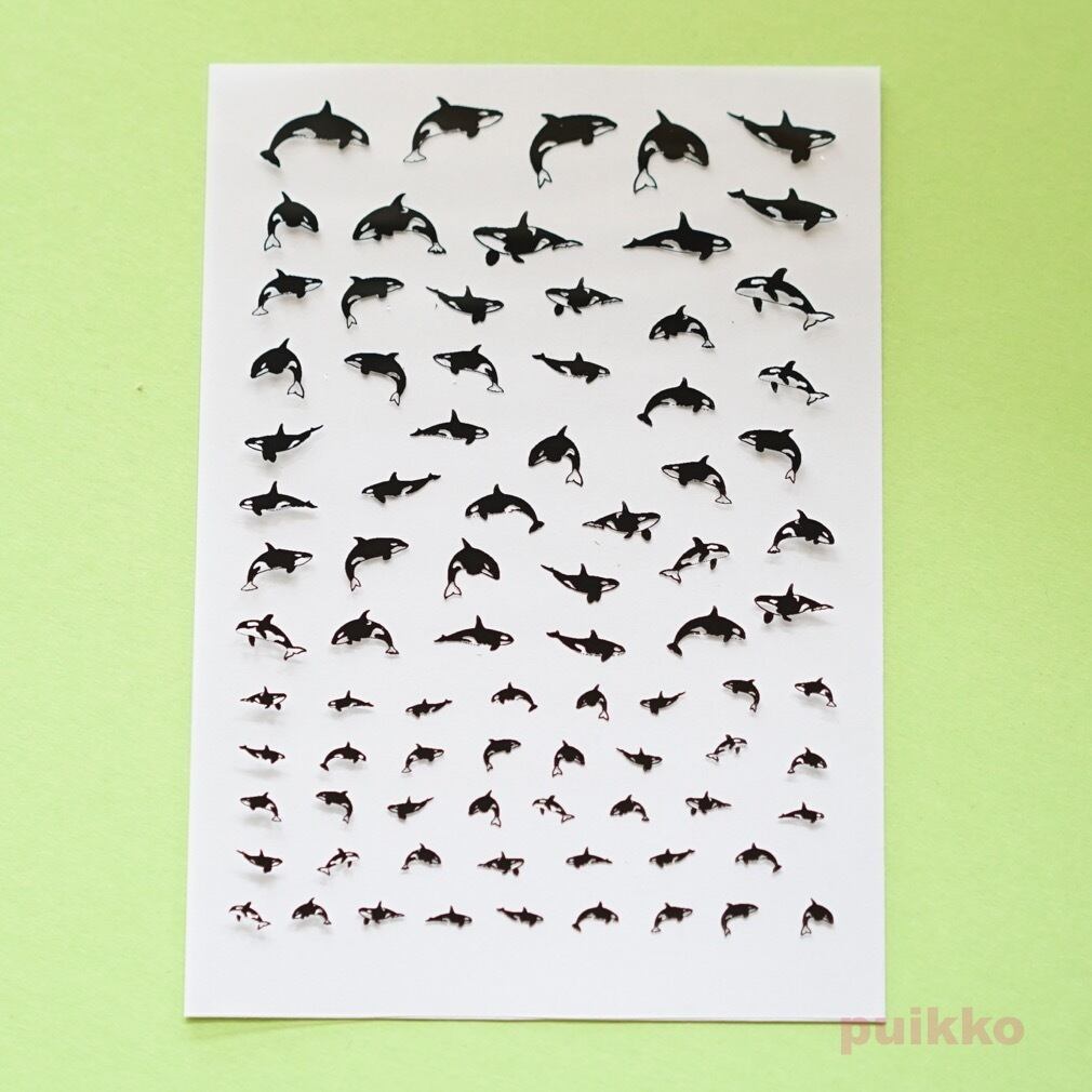 黒白のツートンカラー、目の上のアイパッチと呼ばれる白い模様が特徴。シャチのシルエットイラスト10種をサイズにバリエーションをつけて収録しました。