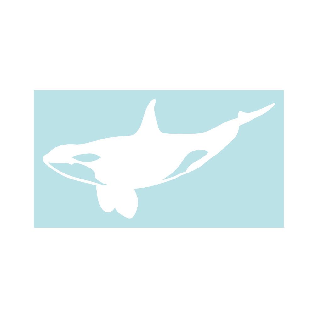 黒白のツートンカラー、目の上のアイパッチと呼ばれる白い模様が特徴。このステッカーでは本来白い部分は切り抜いています。そのため厳密にはシルエットとはいえませんがシャチかどうか見分ける重要な要素なのでこうしました。