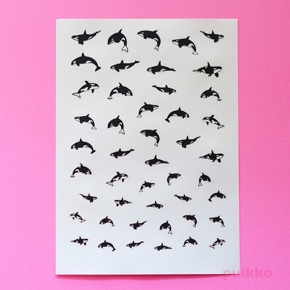 シャチのシルエットを透明シールにモノクロで印刷しました。