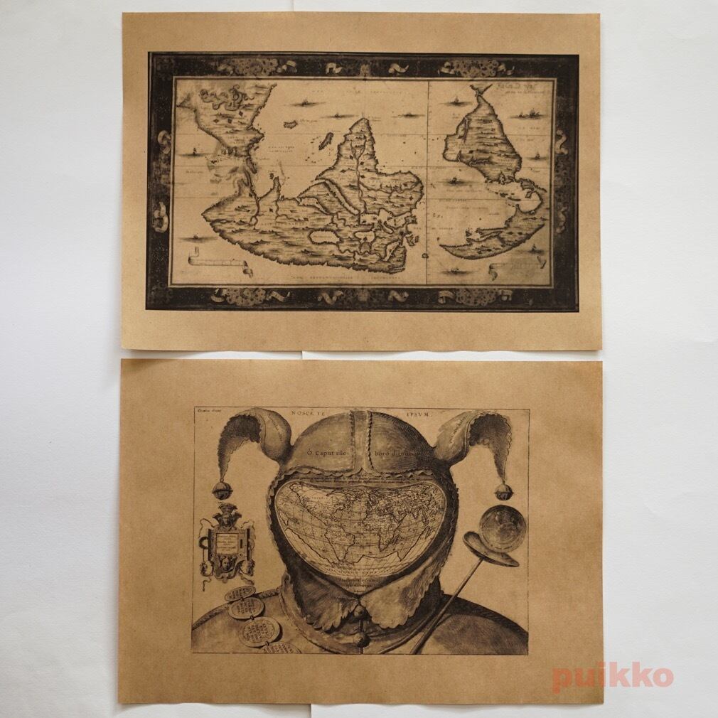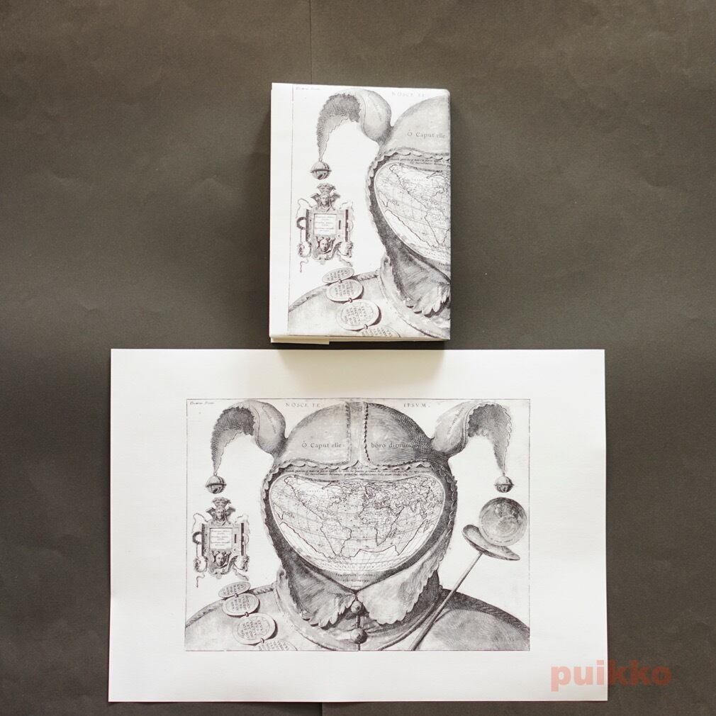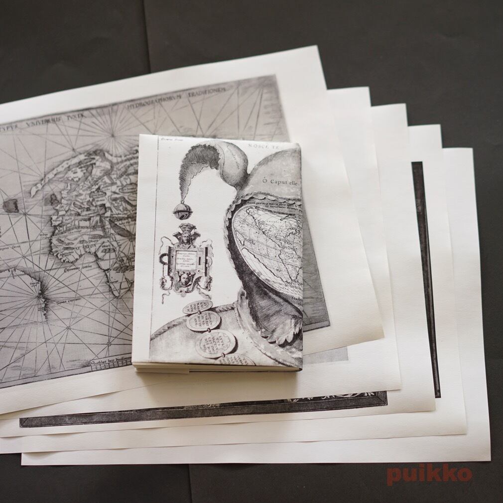 16世紀の世界地図をもとにモノクロ印刷しました。周囲に余白がありますが、文庫本用に天地左右を折ったときにちょうど余白が隠れるサイズとなっています。
