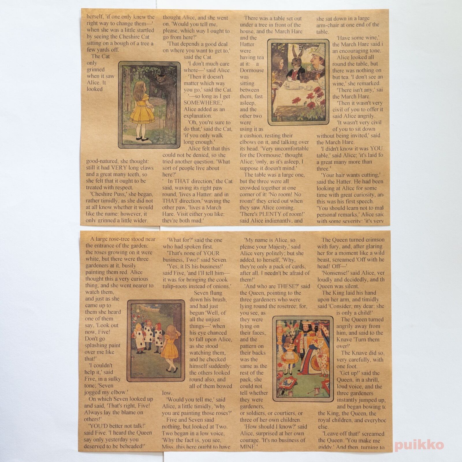 「不思議の国のアリス」の原文と挿絵を使ってカラー印刷した紙製ブックカバーです。