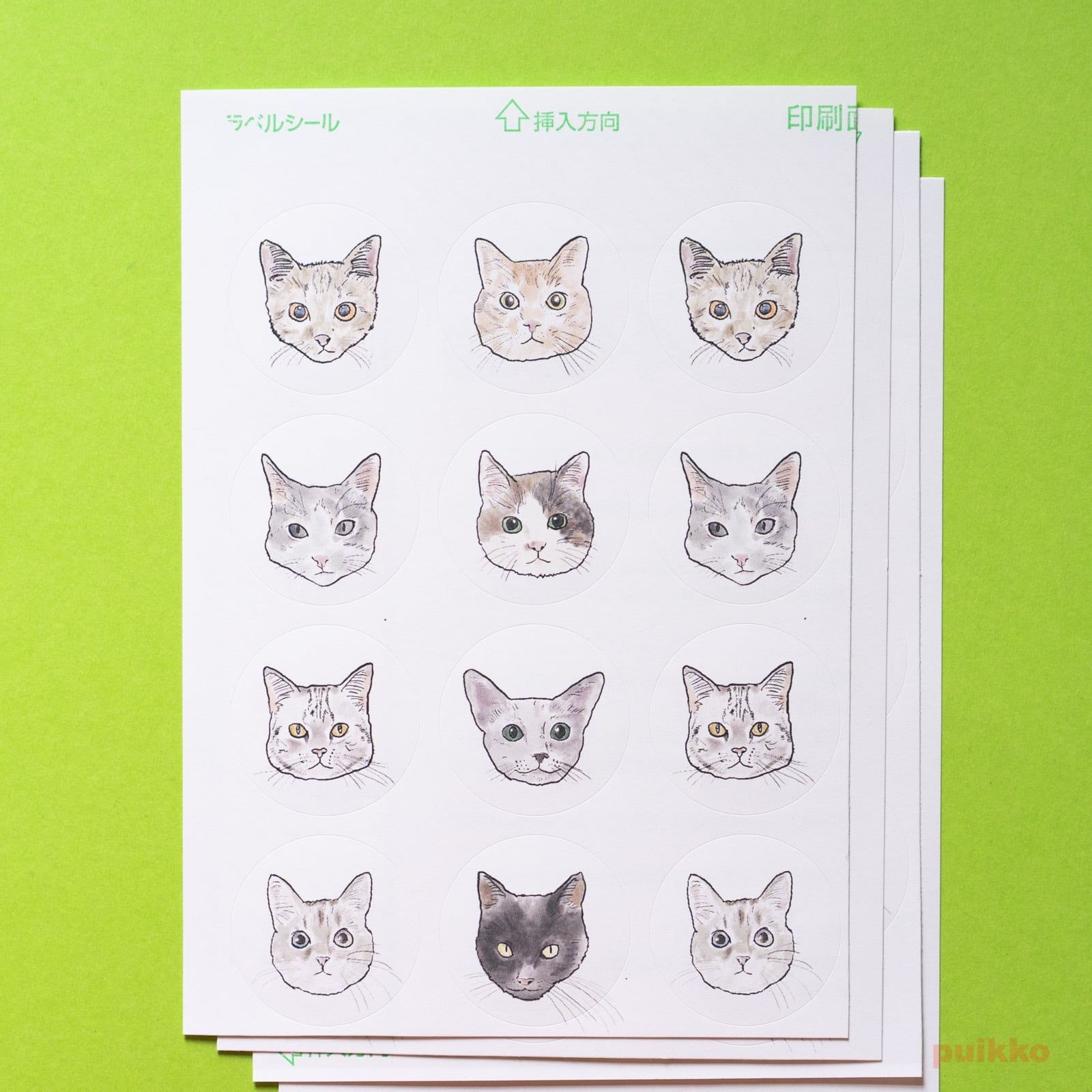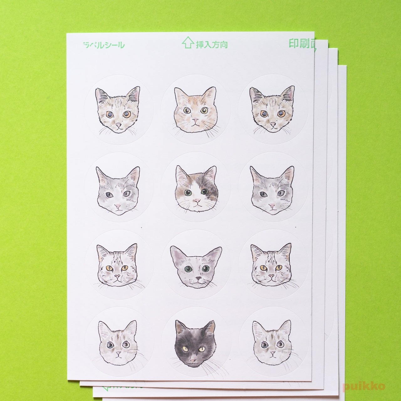 三毛猫や黒猫など猫の顔のイラスト6種各8片をシールにしました。