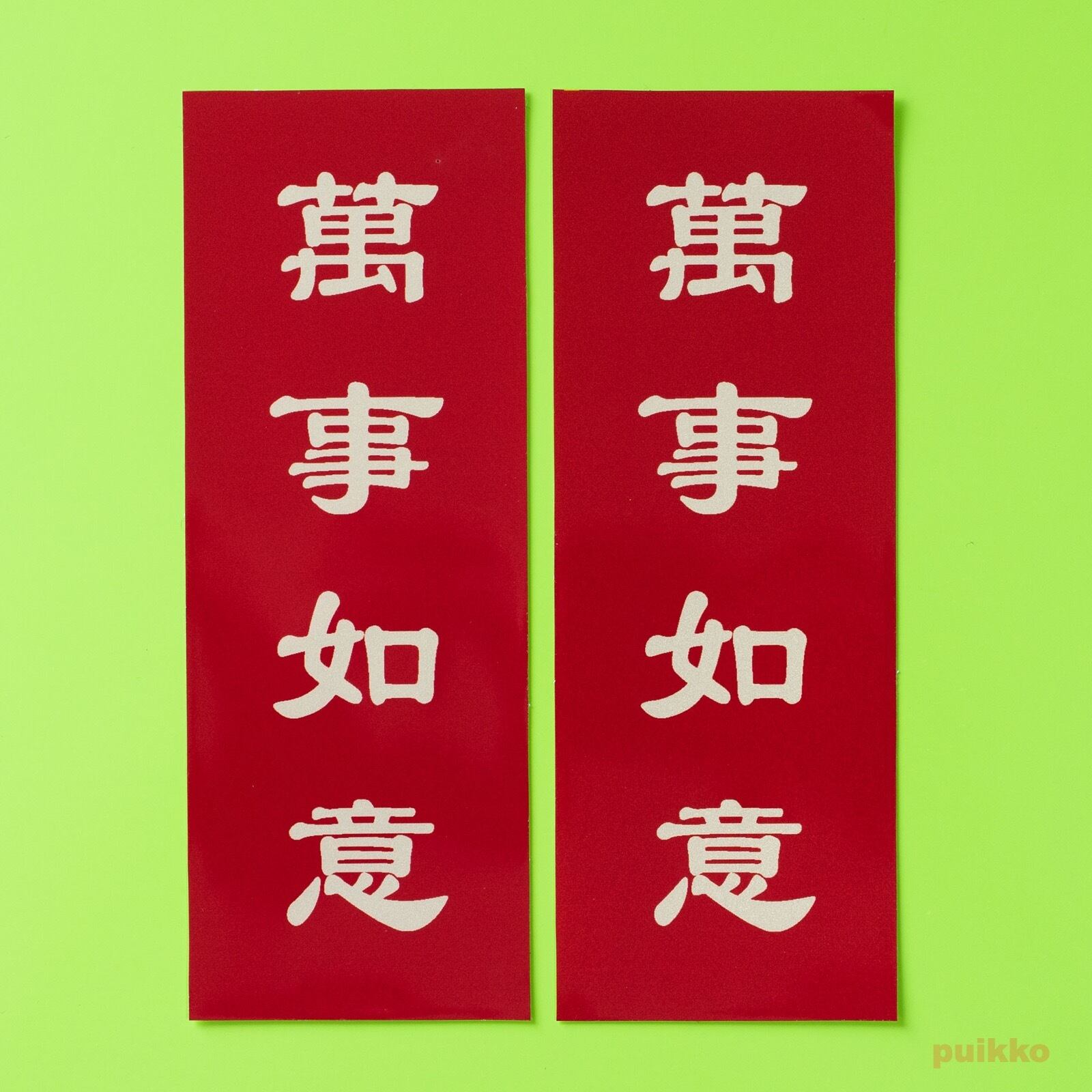 赤地に「萬事如意」という金文字の耐水シールです。同じもの2枚のセットです。