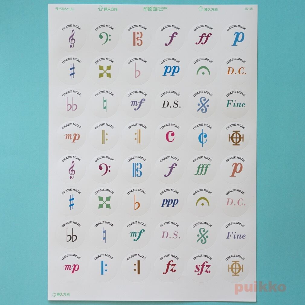 28種の音楽記号(ト音記号、ヘ音記号、ハ音記号、シャープ、ダブルシャープ、フラット、ダブルフラット、ナチュラル、メゾフォルテ、メゾピアノ、リピート記号始まりと終わり、ダ・カーポ、ダル・セーニョ、フィーネなど)を色違いで収録しました。