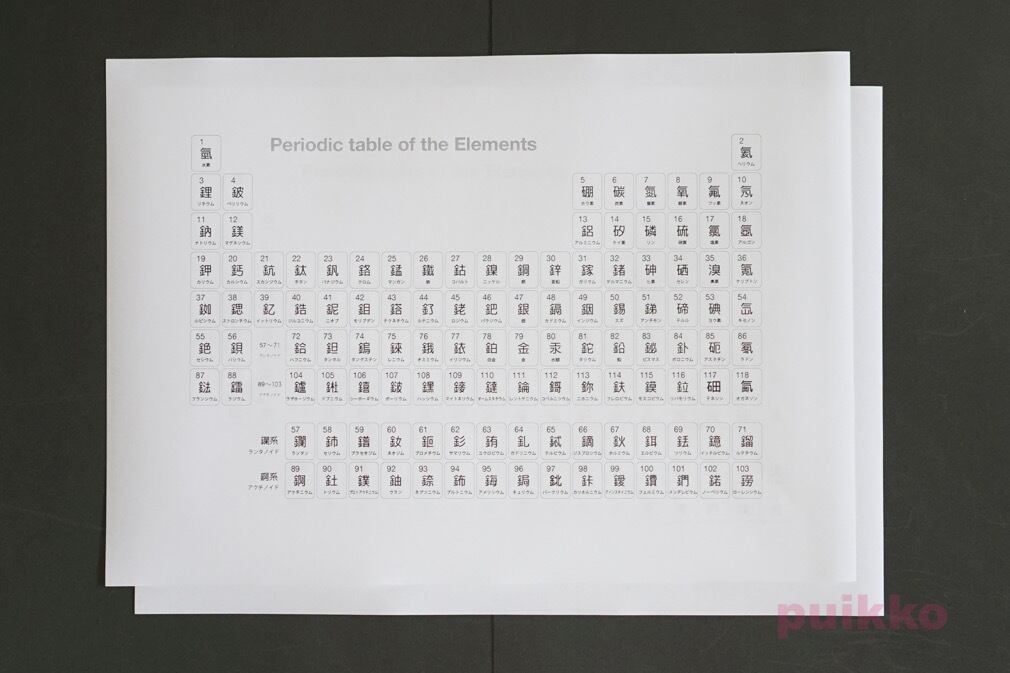化学の授業でおなじみ、元素周期表をそのままブックカバーにしました。原子番号、元素記号、元素名を記してある日本語版、元素名を英語で記してある英語版、そしてすべての元素名を漢字1文字で記してある中文繁体字版の3種を各2枚収録。中国語の元素名は中国と台湾では一部違いがあるものがありますが、この表では台湾で使われている元素名を記しています。