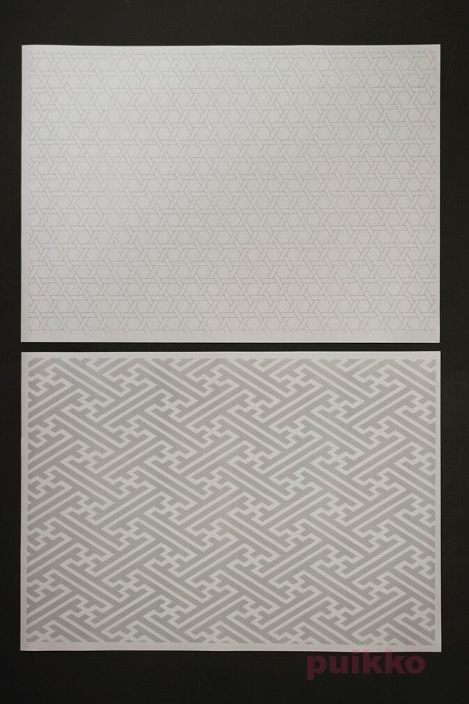 和柄でおなじみのパターン5種(七宝、麻の葉、籠目、紗綾、雪輪)をそれぞれ一面に敷き詰めました。
