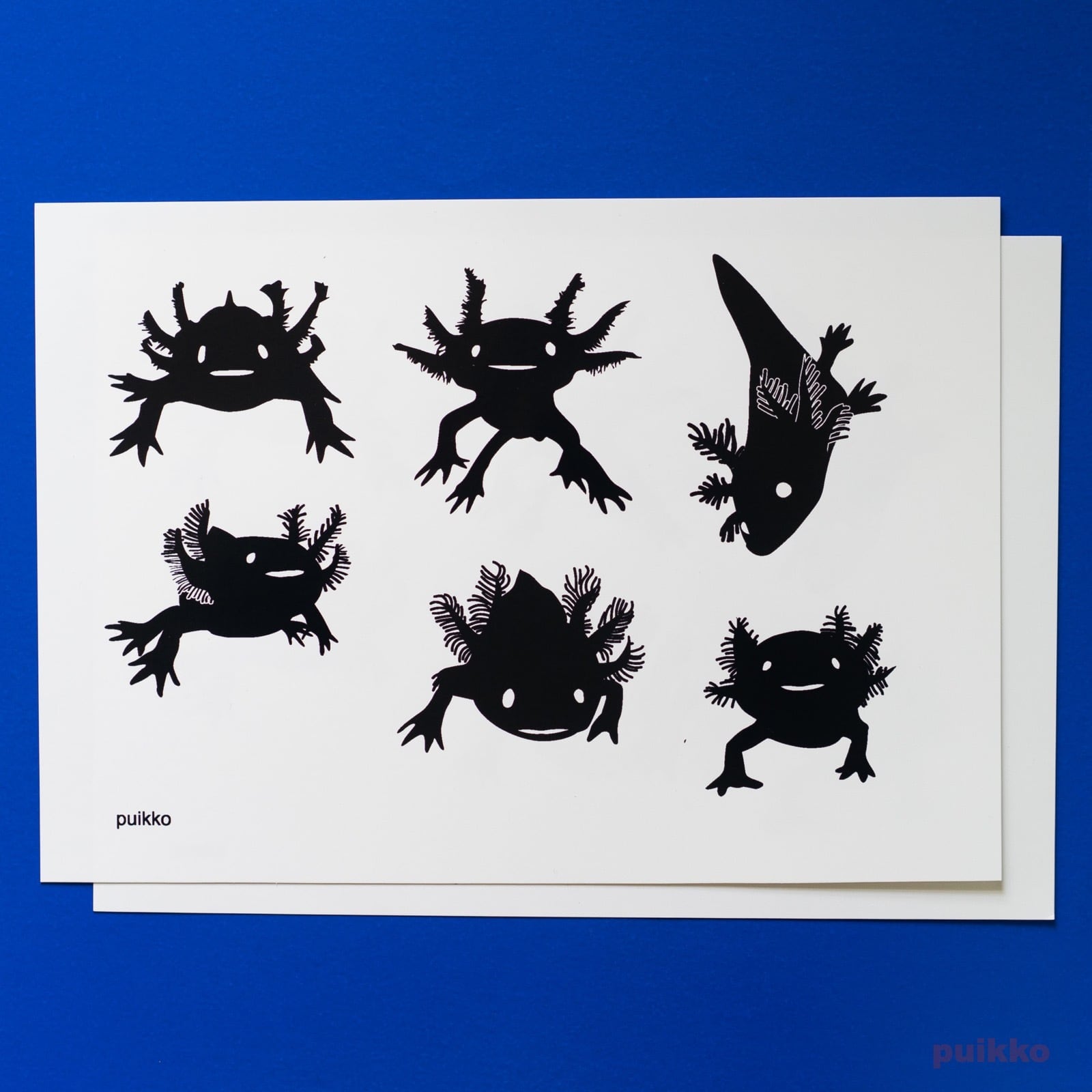 ウーパールーパー(メキシコサンショウウオ/メキシコサラマンダー/アホロートル)は一時期大ブームとなり今も根強い人気の両生類。幼生成熟(ネオテニー)が特徴のいやし系ペットです。このウーパールーパーのシルエットイラスト6点をシールにしました。
