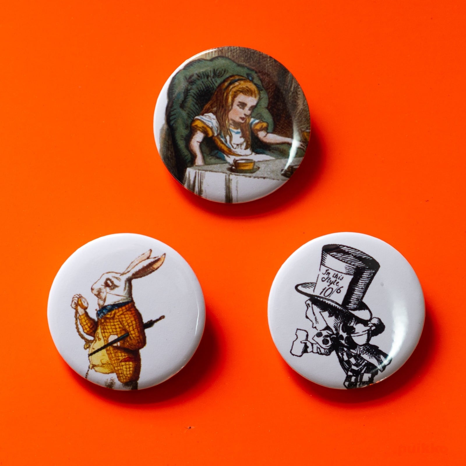 「不思議の国のアリス」ジョン・テニエルのイラスト3種を缶バッジ(直径32mmの丸型)にしました。