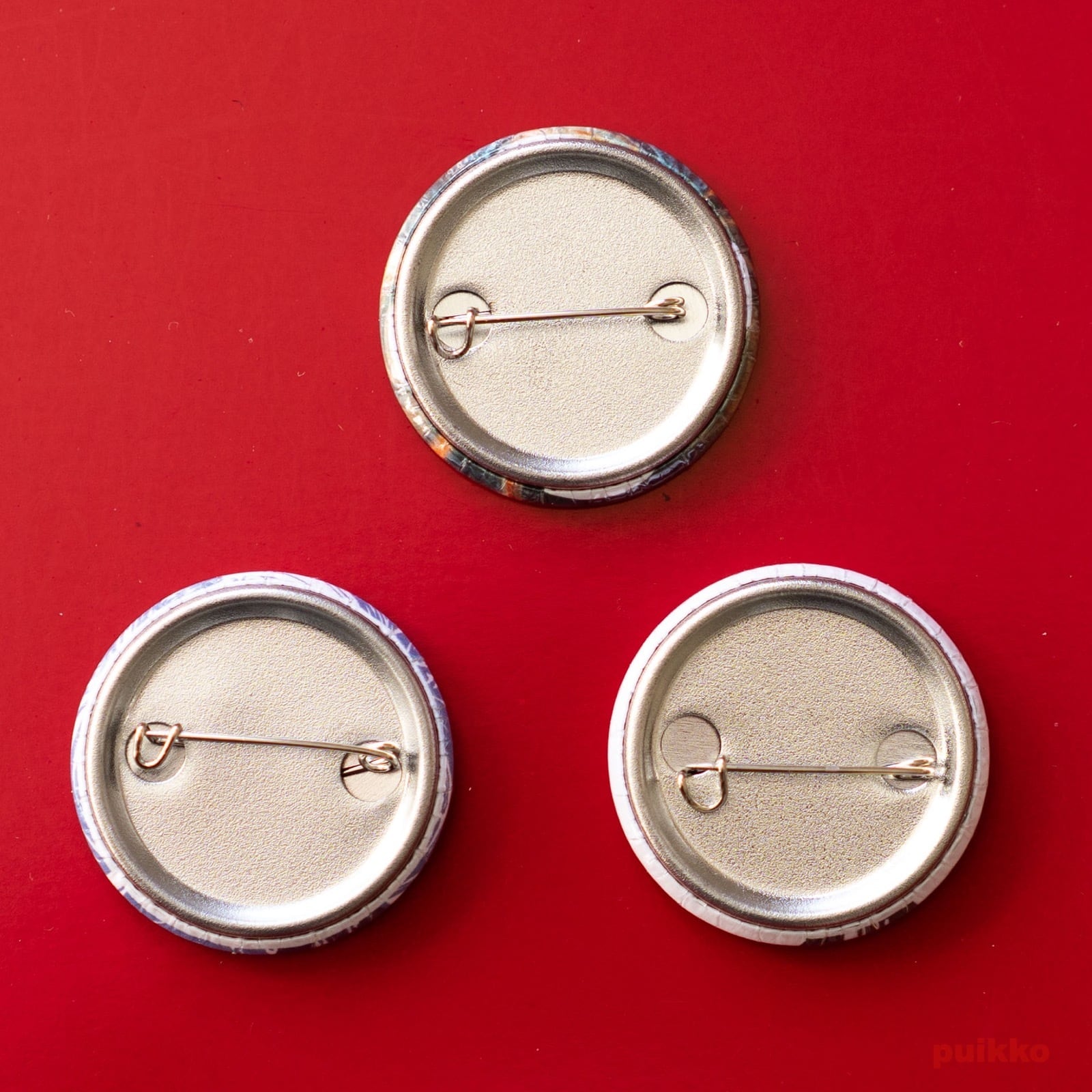 裏面のピンは表面の絵柄に対して必ずしも水平にはなっていません。服やカバンなどに止める際に角度を調整してとめてください。