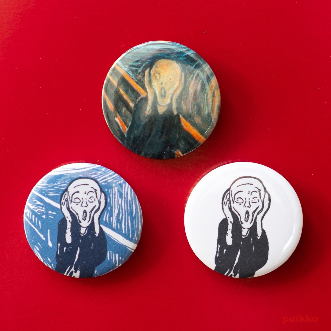 ノルウェーの有名な作家エドヴァルド・ムンクの「叫び」に描かれている人物および背景をトレースしました。「叫び」は同じ構図で5回描かれていますが、そのうち1895年のリトグラフをもとに背景なし、ありの2点、そして1893年に描かれた油彩画(最初に描かれたもの)をトリミングしたものを1点の計3点を缶バッジにしました。