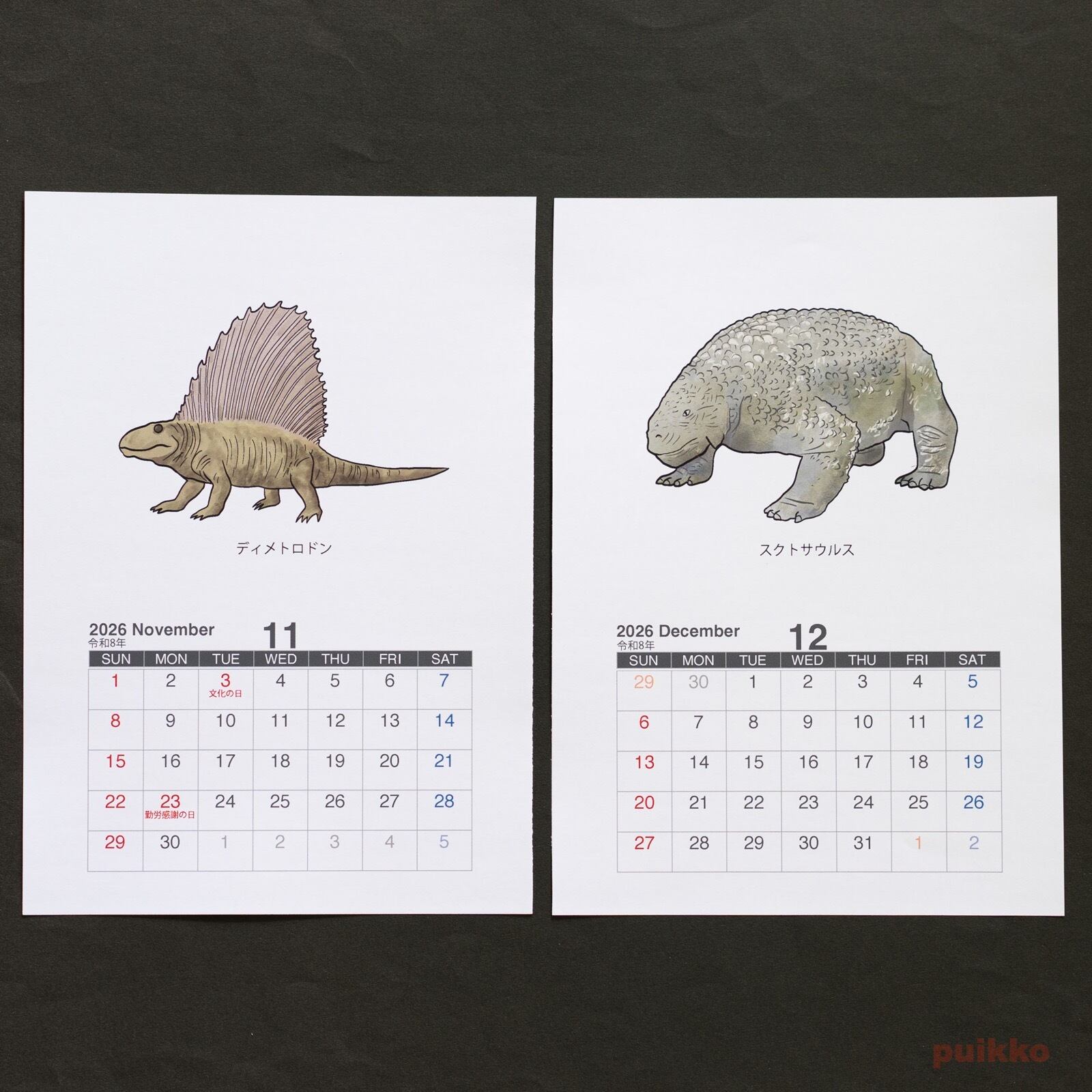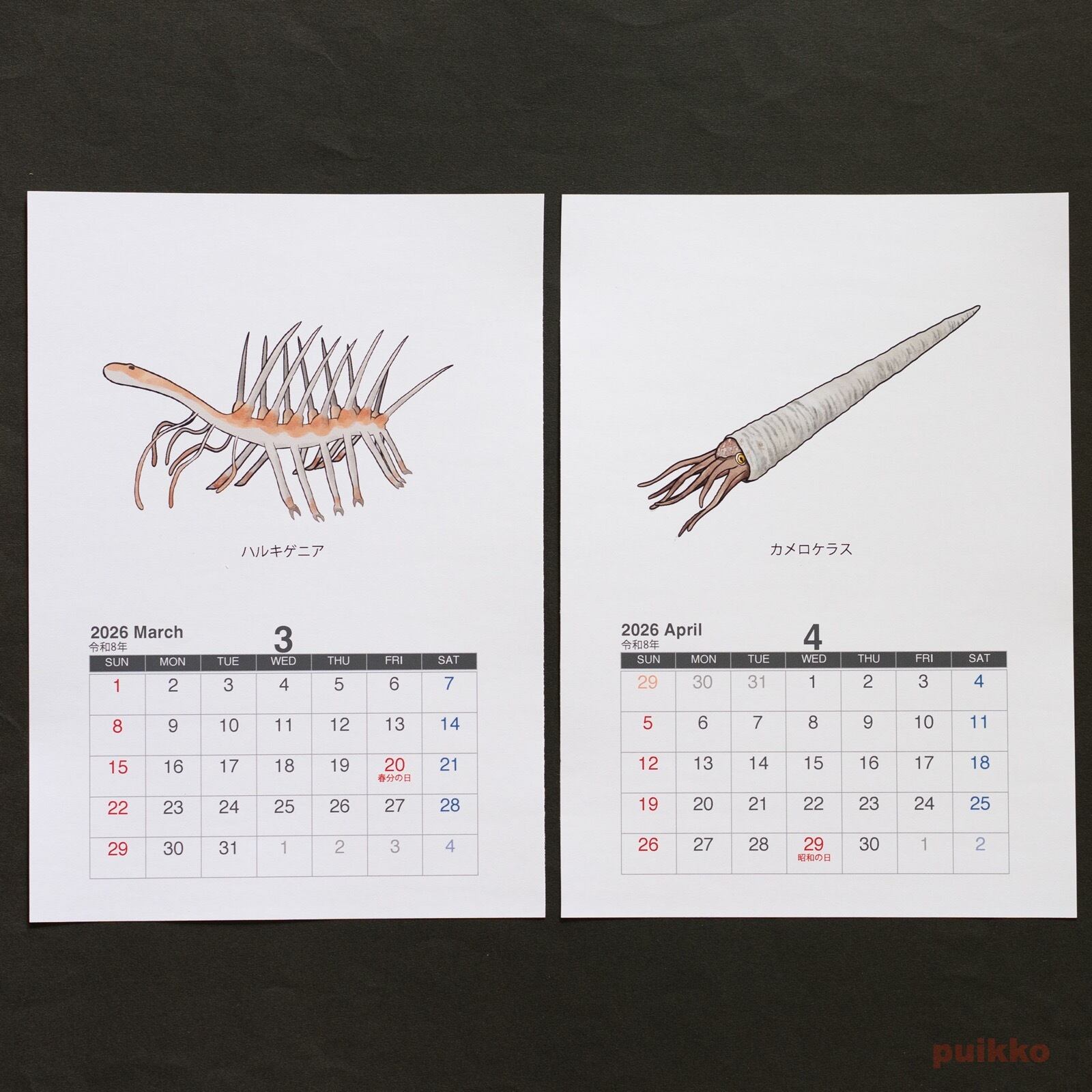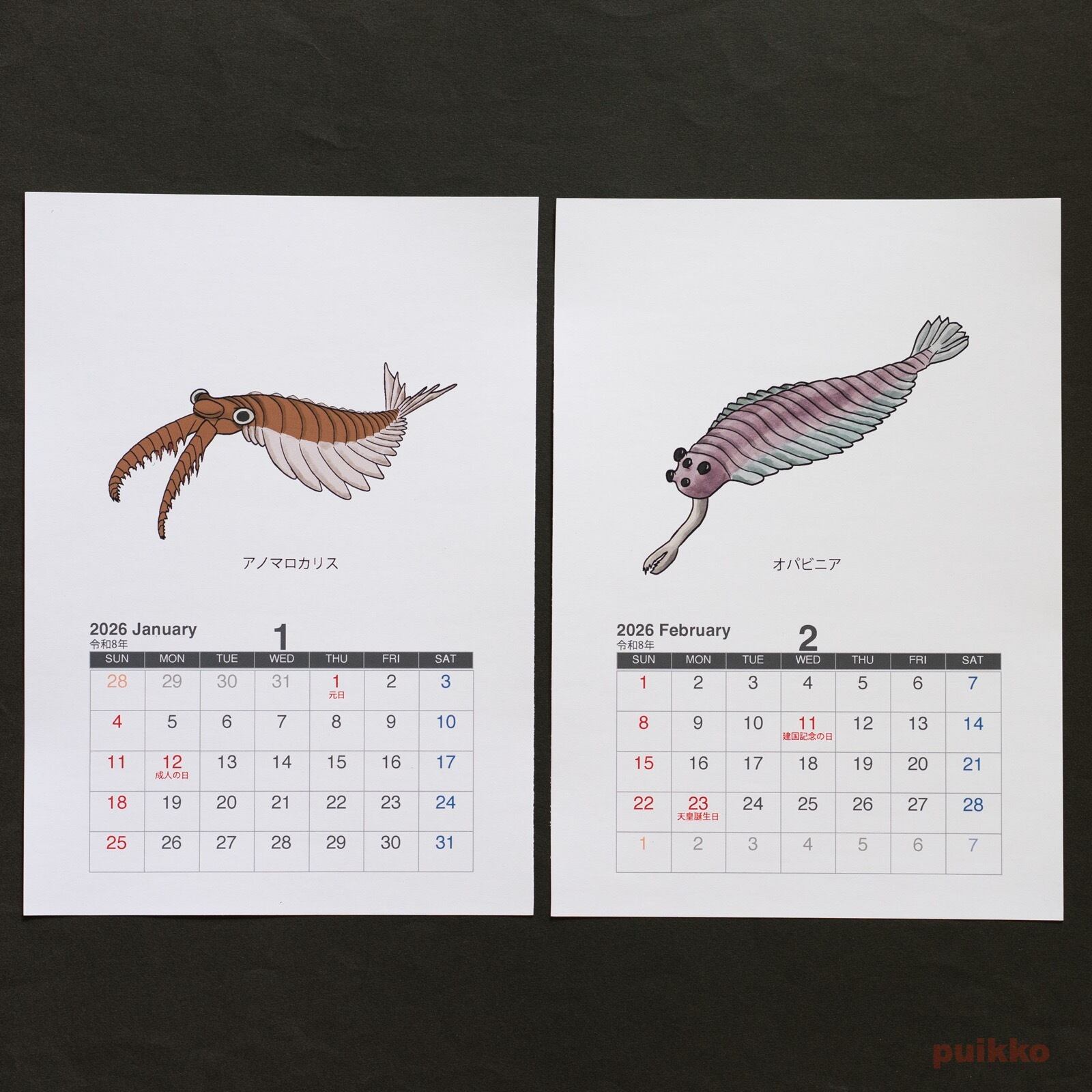 古生代の生物のイラストを使った壁掛けタイプのカレンダーです。