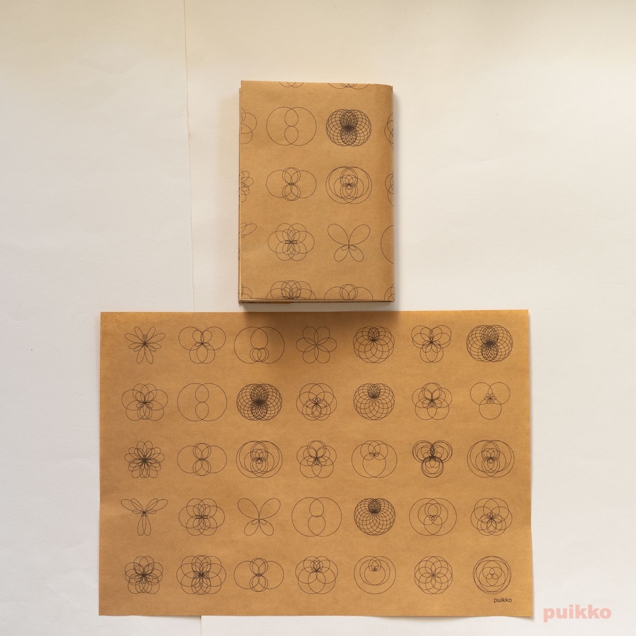 使用した用紙はクラフト紙(ブラウン)と再生紙(コピー紙よりやや厚く、黄味がかった白)の2タイプ。お好みのほうをお選びください。ブックカバーとして使うだけでなく、小物の包装紙、写真撮影の背景紙などアイデア次第でいろいろ活用できます。折らずに発送します。