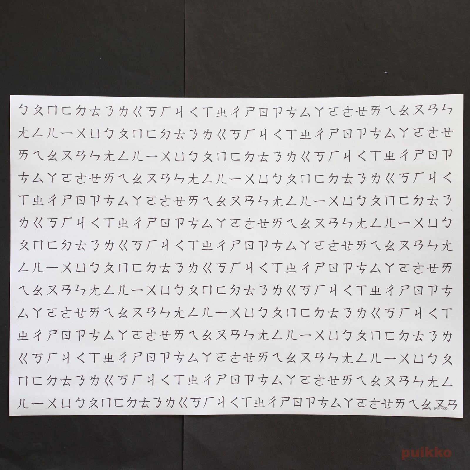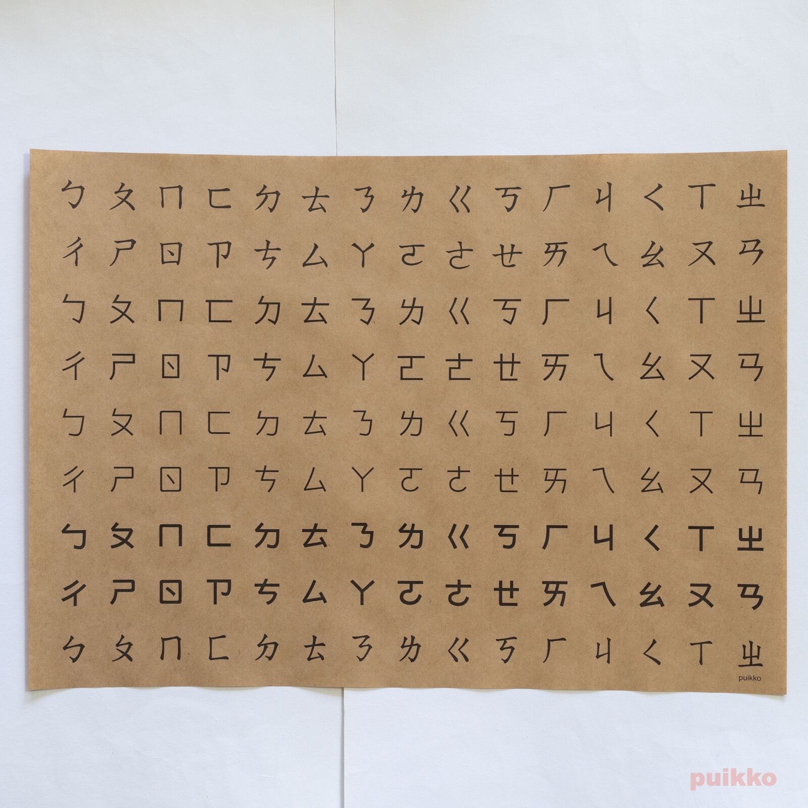 主に台湾で用いられている発音記号・注音符号。先頭の4文字をとってボポモフォともいわれています。台湾では初等教育でこれを習い、漢字の発音をこれで覚える他、キーボードや携帯の入力にも用いています。