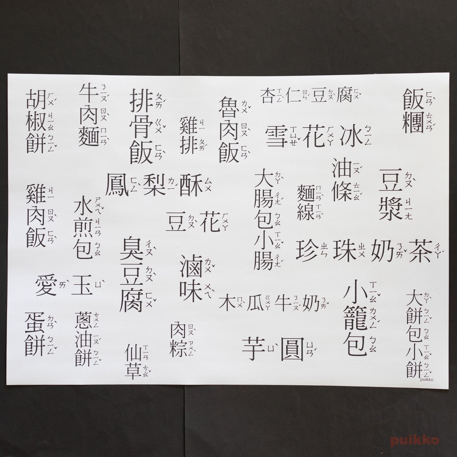 ブックカバー1、2、5枚めは注音符号そのものを並べたもの、3枚めは台湾の代表的な小吃やドリンクの名称に注音符号でルビをつけたもの、4枚めは注音符号をキーボードから入力するときの配置を示したものです。