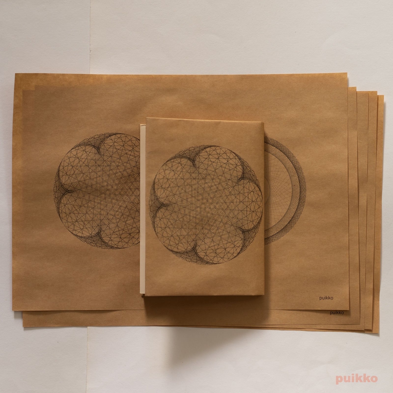 使用した用紙はクラフト紙(ブラウン)と再生紙(コピー紙よりやや厚く、黄味がかった白)の2タイプ。お好みのほうをお選びください。ブックカバーとして使うだけでなく、小物の包装紙、写真撮影の背景紙などアイデア次第でいろいろ活用できます。折らずに発送します。