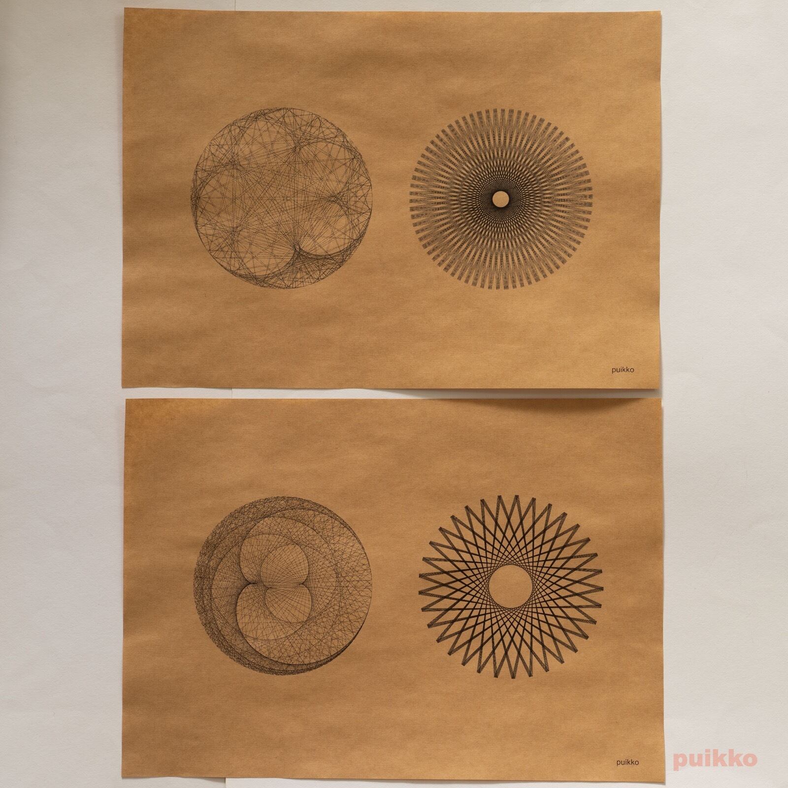ストリングアートとは木製の土台に釘を打って糸をかけて制作するウォールアートのこと。これを数式を使って再現しました。円周上に等間隔で釘を打ち、そこに一定の規則で糸を掛けることによって複雑な絵柄を作っています。