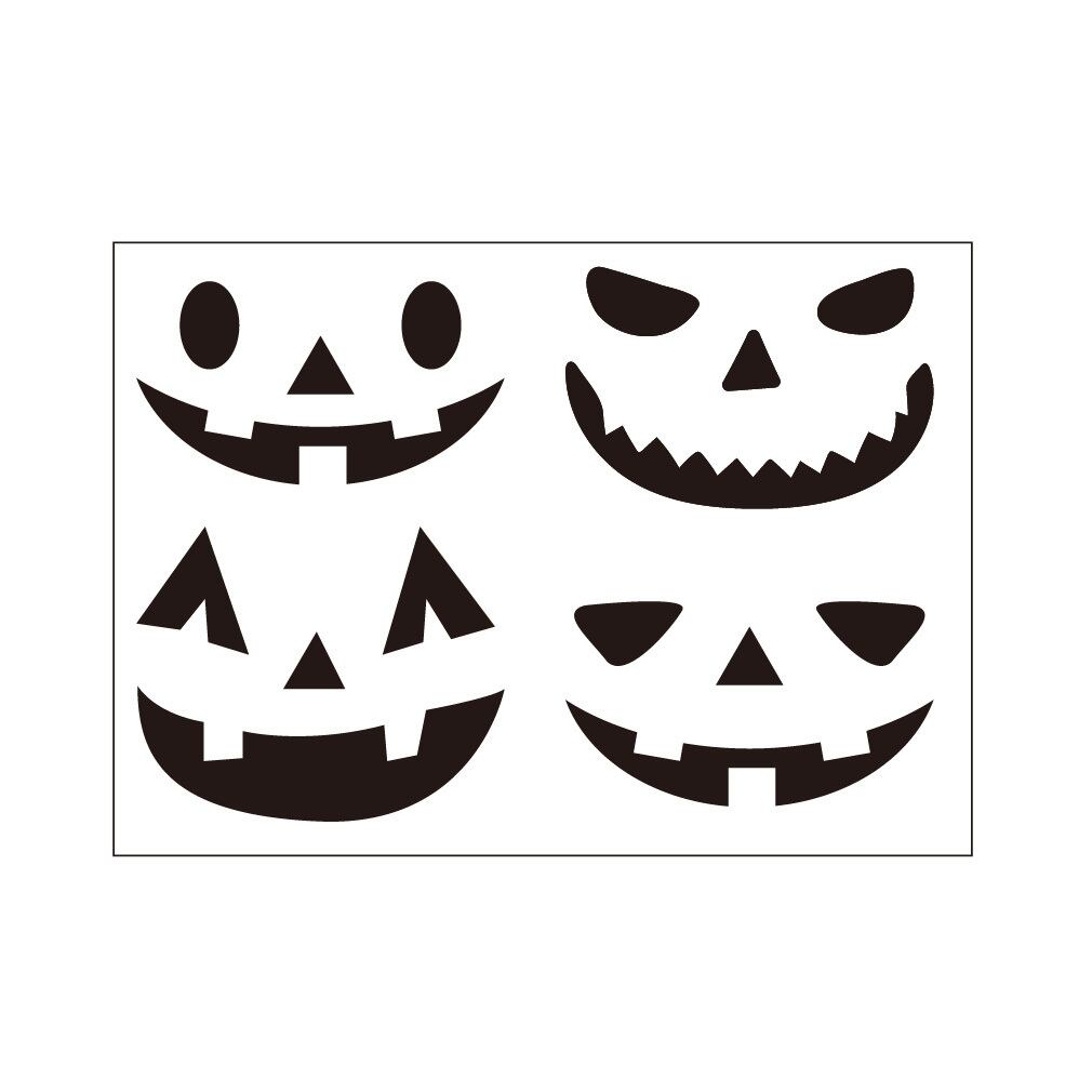 通常はカボチャからくり抜いて作る部分のみを描いたステッカーです。1枚のシートに幅60mmの顔4つが入っています。本物のカボチャに貼り付けてお手軽ジャック・オー・ランタンを作ったり、マグカップに貼ったりスマホケースに貼ったりとアイディアしだいでいろいろ活用できます。