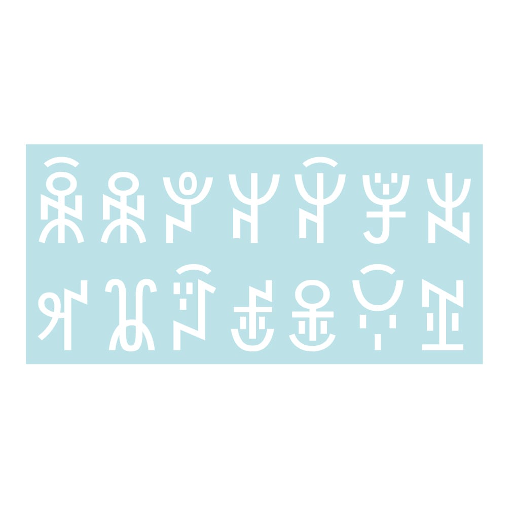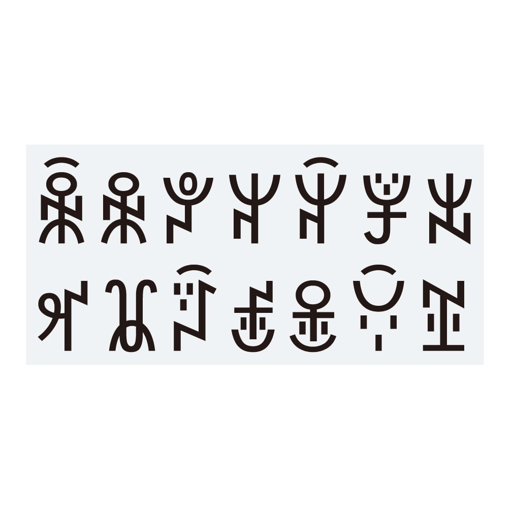 彝(イ)語とは、中国の雲南省、四川省などに住む少数民族の言語。彝語を表記するのに用いる文字が独特の文字・彝(イ)文字です。彝文字は元々は漢字と同様の表語文字でしたが、現在は音節文字となっています。標準化された文字だけで819文字あり、そのごく一部、人の動作のように見えるもの、顔のように見えるかわいいもの14点を選びました。