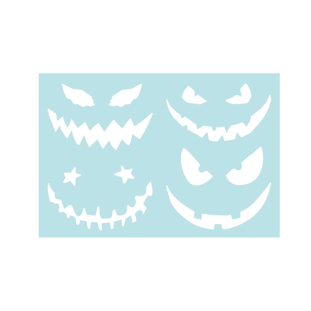 通常はカボチャからくり抜いて作る部分のみを描いたステッカーです。1枚のシートに幅60mmの顔4つが入っています。今回は怖い表情を多めにしました。