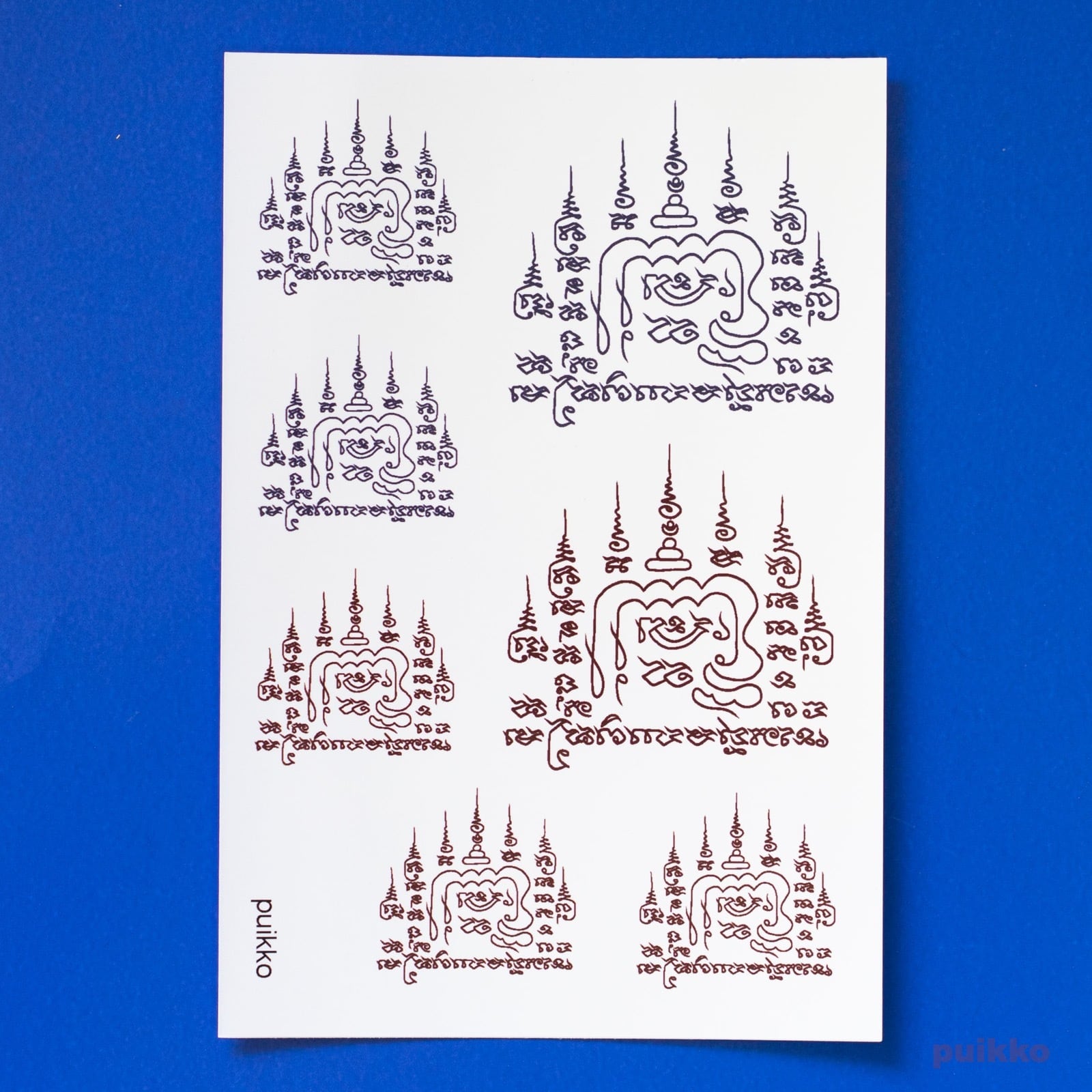 サクヤンには数多くの種類がありますが、その中でヤント・プットソーンをタトゥーシールにしました。ヤント・プットソーンは五仏のヤントラとも言われ、これを身に着けた人に愛、昇進、幸運、魅力を与え、あらゆる偶発的な危険から身を守る力があると信じられています。