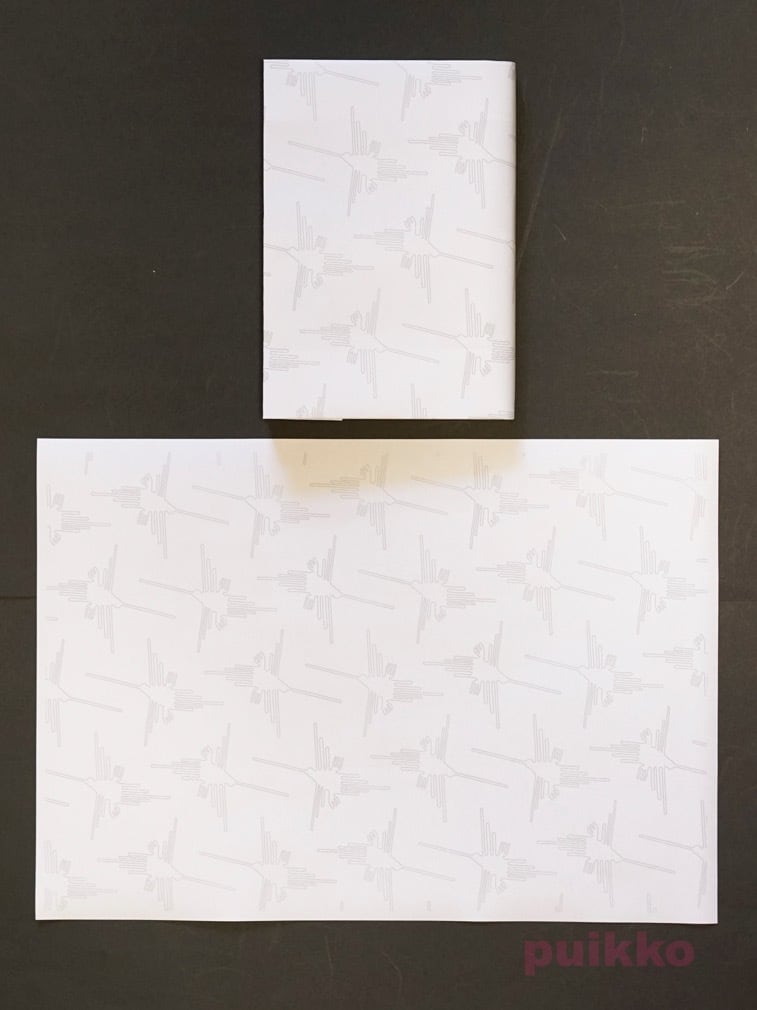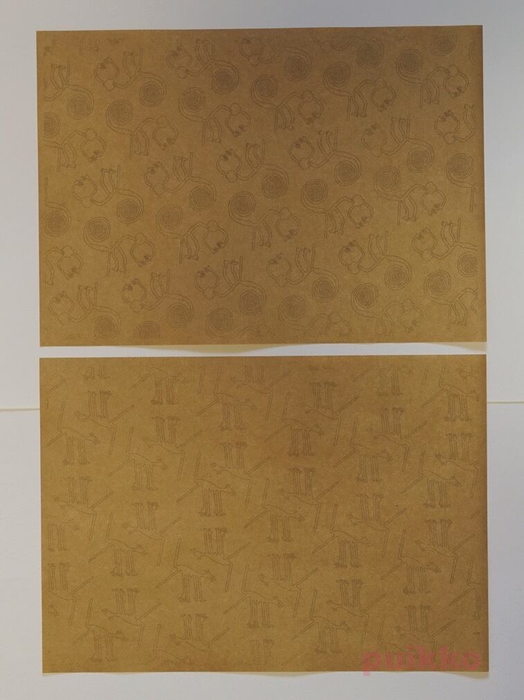 使用した用紙は再生紙(環境紙 コピー紙よりやや厚く、黄味がかっている)とクラフト紙の2タイプ。お好みのほうをお選びください。ブックカバーとして使うだけでなく、小物の包装紙、写真撮影の背景紙などアイデア次第でいろいろ活用できます。折らずに発送します。