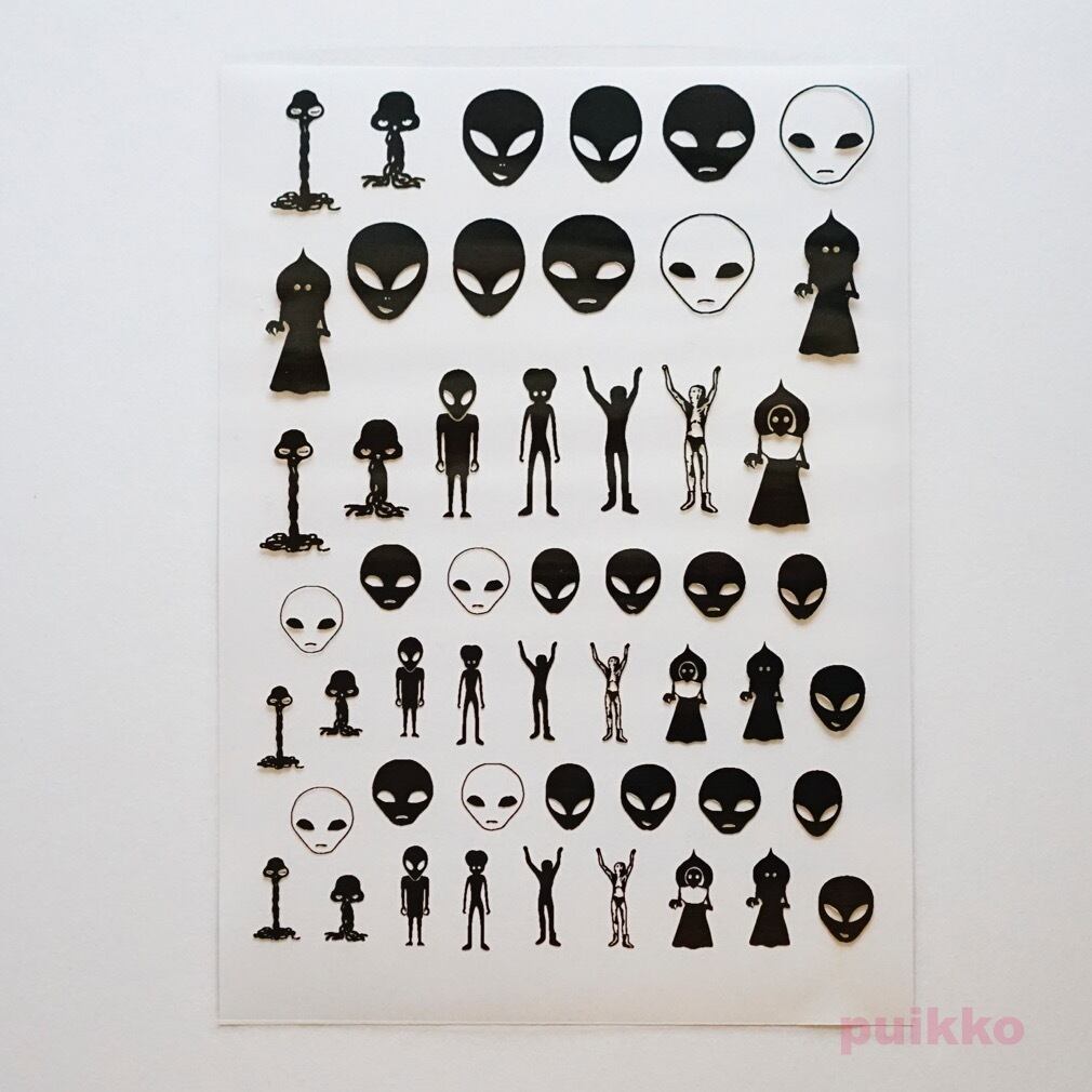 グレイやタコ型火星人など宇宙人のシルエットイラストをOHPフィルムにモノクロで印刷し、金の箔を押しました。