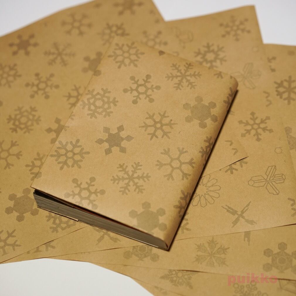 使用した用紙は再生紙(環境紙 コピー紙よりやや厚く、黄味がかっている)とクラフト紙の2タイプ。お好みのほうをお選びください。ブックカバーとして使うだけでなく、小物の包装紙、写真撮影の背景紙などアイデア次第でいろいろ活用できます。折らずに発送します。