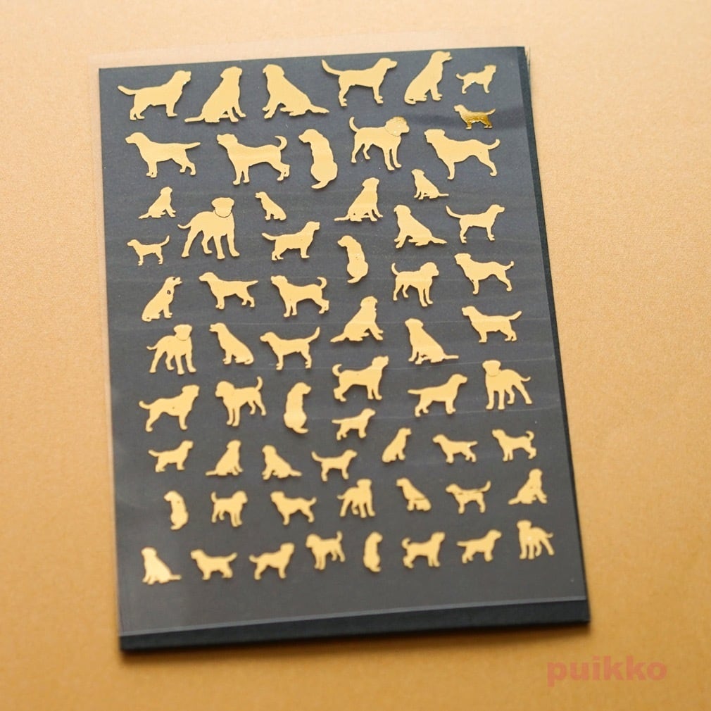 ラブラドール・レトリバーのシルエットイラストをOHPフィルムにモノクロで印刷し、金の箔を押しました。