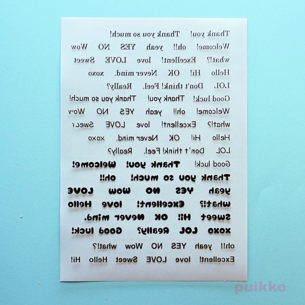 Thank you、Helloなど英語の単語やフレーズをOHPフィルムにモノクロで印刷し、金の箔を押しました。