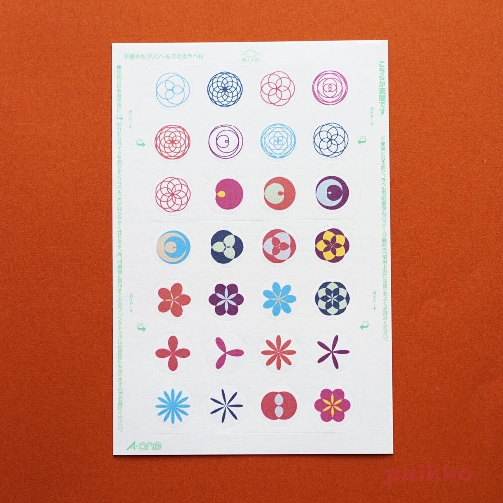 シール1片は直径15mmの円。はがきサイズのシート4枚に56種×2片収録。