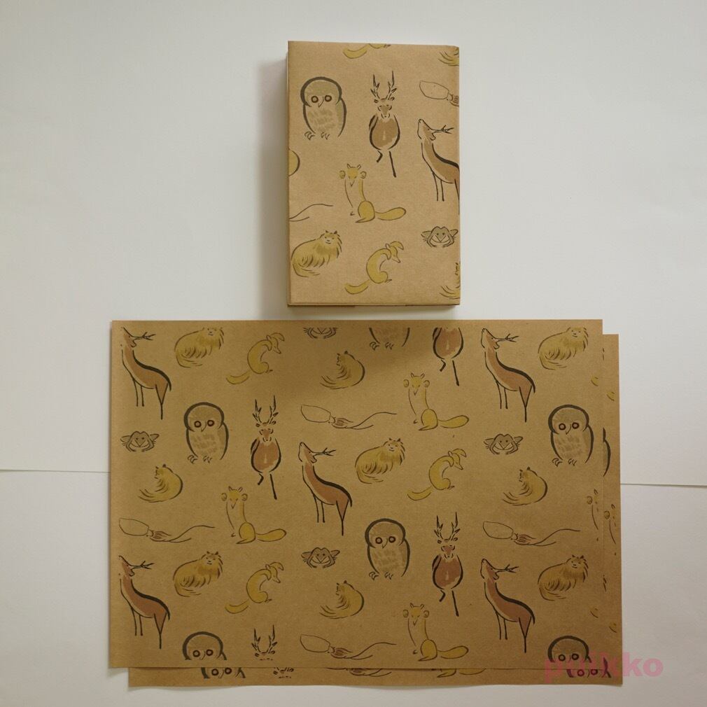 使用した用紙は再生紙(環境紙 コピー紙よりやや厚く、黄味がかっている)とクラフト紙の2タイプ。お好みのほうをお選びください。ブックカバーとして使うだけでなく、小物の包装紙、写真撮影の背景紙などアイデア次第でいろいろ活用できます。折らずに発送します。