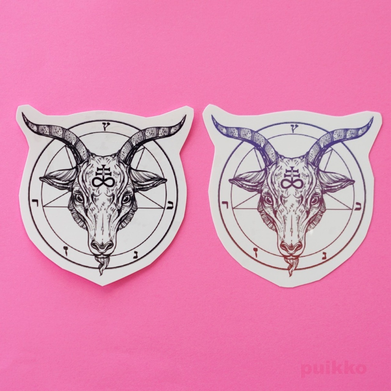 バフォメットはキリスト教における有名な悪魔。黒ミサを司り、両性具有で黒山羊の頭と黒い翼をもつ姿で知られています。このステッカーは、バフォメットの顔をモチーフにしたシンボルを印刷したものです。色違いで2枚収録しました。