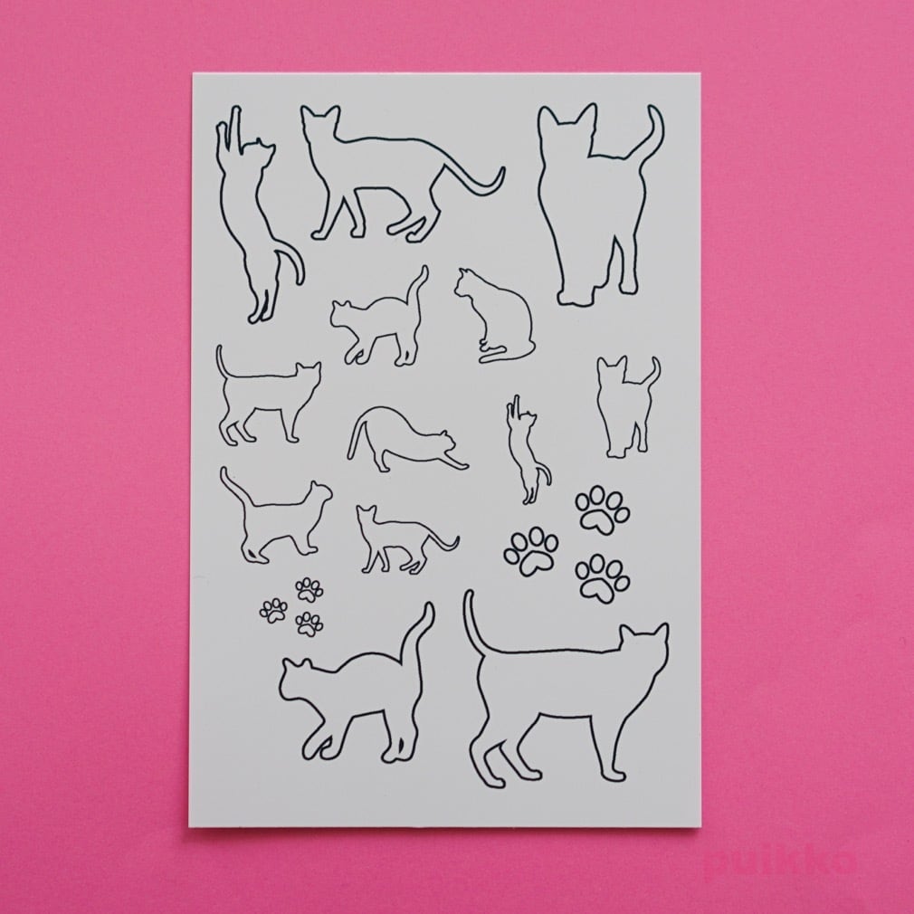 猫の線画イラスト8種と猫の足跡のタトゥーシールです。