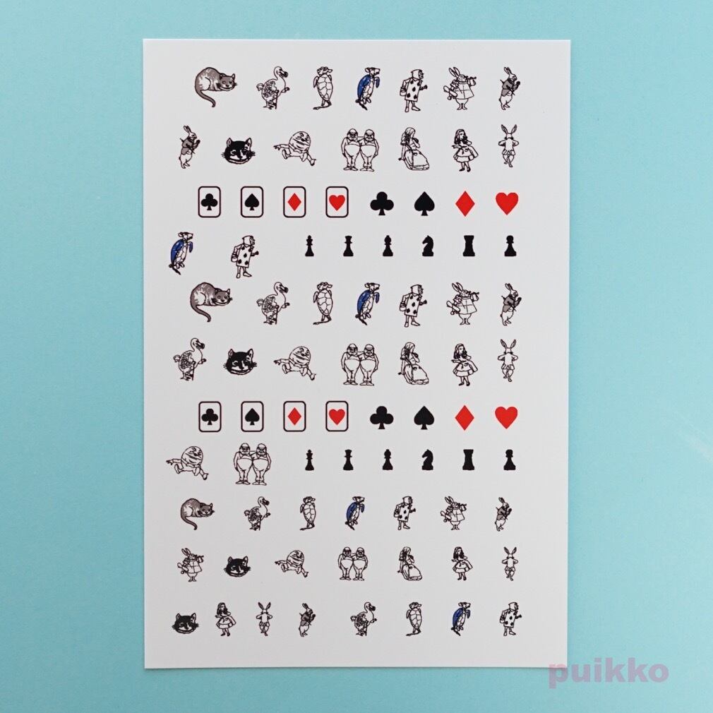 ルイス・キャロル著「不思議の国のアリス」「鏡の国のアリス」に登場するキャラクターのイラストをネイルシールにしました。ジョン・テニエルによる元絵を簡略化してトレースしたものです。収録したキャラクター アリス、白うさぎ、庭師、偽ウミガメ、ドードー鳥、チェシャ猫、トゥイードルダムとトゥイードルディー、ハンプティ・ダンプティ。その他トランプの記号とチェスの駒を収録し、サイズにバリエーションをつけました。