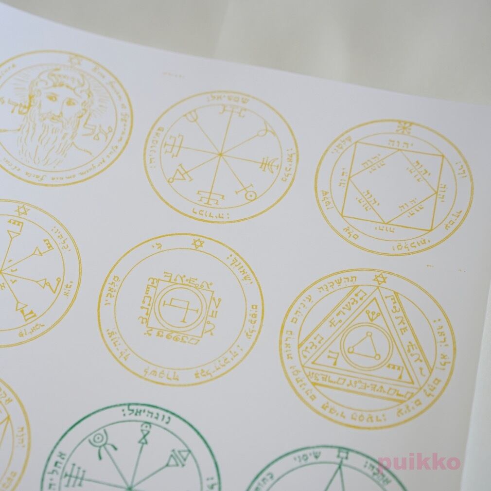 魔導書「ソロモンの大いなる鍵」に記されている七惑星のペンタクル(護符)のうち太陽と金星の護符12点をシールにしました。