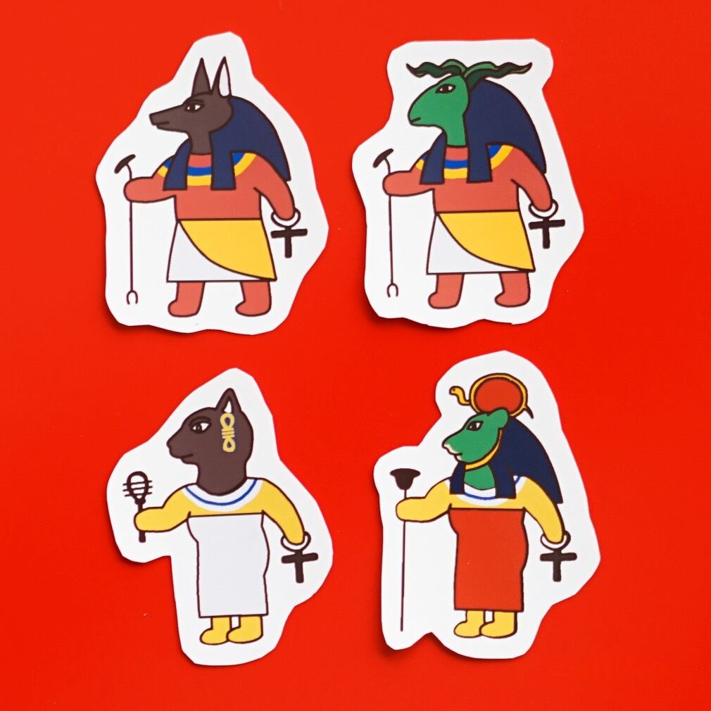 エジプト神話に登場する神様のイラストの吸着シールです。違う絵柄4枚で1セットとなっています。