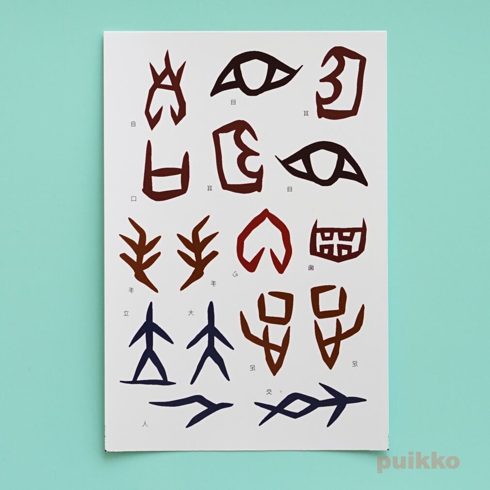 この甲骨文字のうち、「耳」「目」「自」「口」「歯」「心」「手」「足」「大」「立」「交」「人」の字を収録しました。