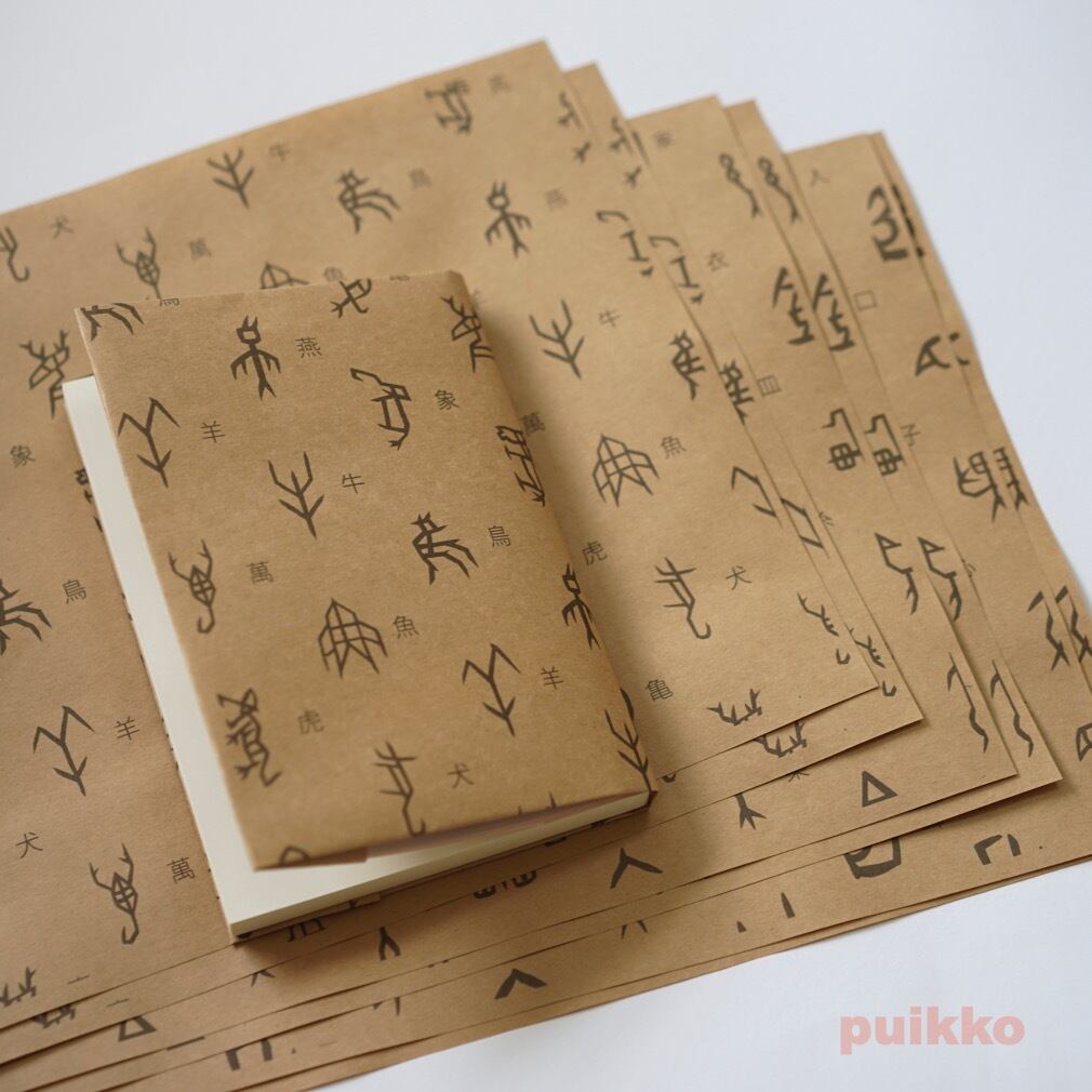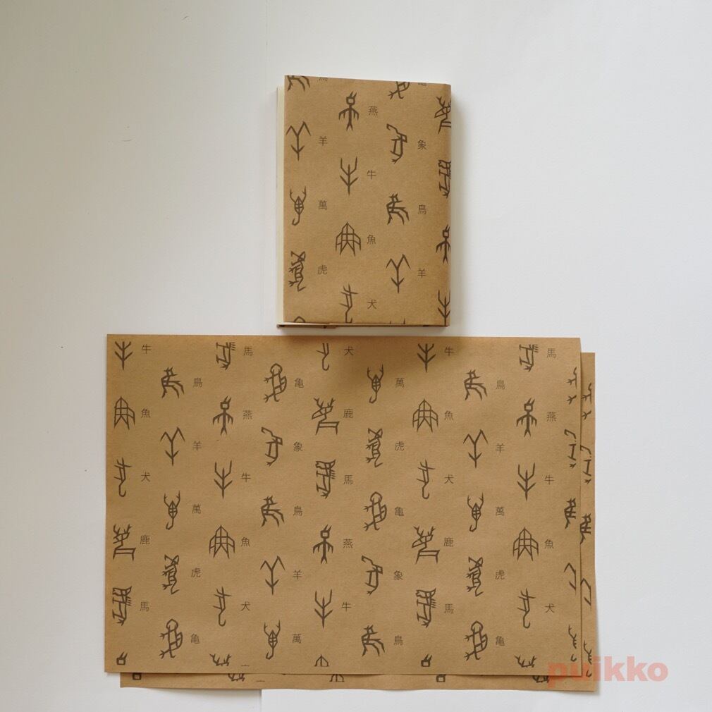 使用した用紙は再生紙(コピー紙よりやや厚く、黄味がかっている)とクラフト紙の2タイプ。お好みのほうをお選びください。ブックカバーとして使うだけでなく、小物の包装紙、写真撮影の背景紙などアイデア次第でいろいろ活用できます。折らずに発送します。