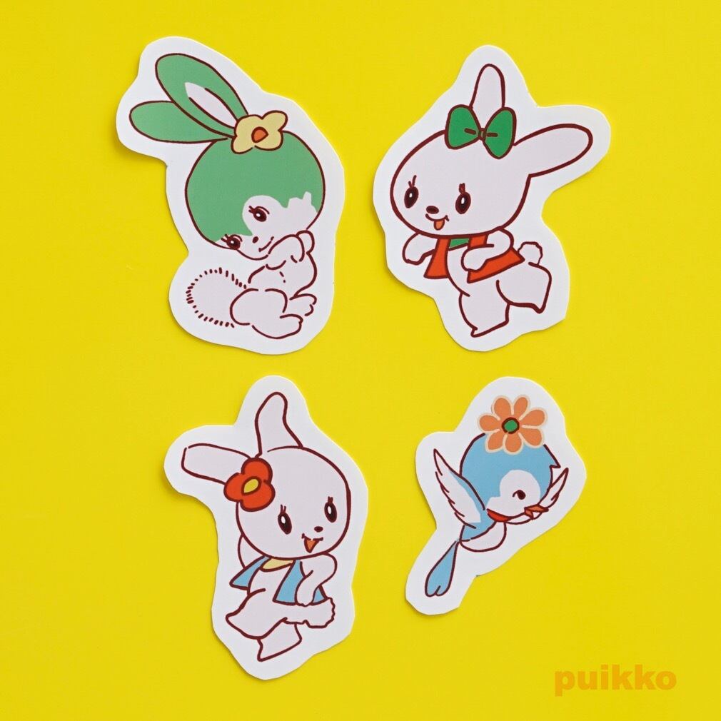 リボンをつけたうさぎ、花を頭につけた小鳥など4種のイラストをシールにしました。
