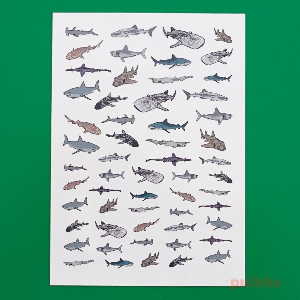 以下のサメをモチーフにしました。シュモクザメ、ジンベイザメ、ナヌカザメ、ニシネズミザメ、ネコザメ、ノコギリザメ、ホシザメ、ホホジロザメ、ミツクリザメ。