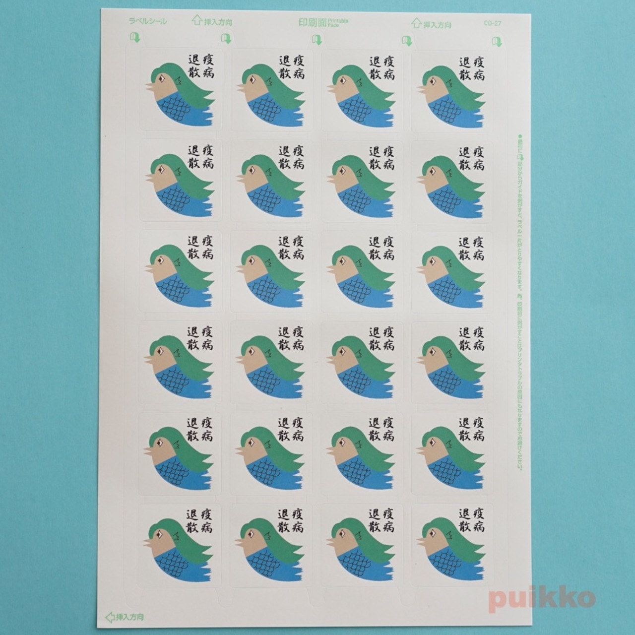 当時の瓦版に描かれた絵をもとに、小鳥風にアレンジしたイラストに「疫病退散」の文字を加えてシールにしました。