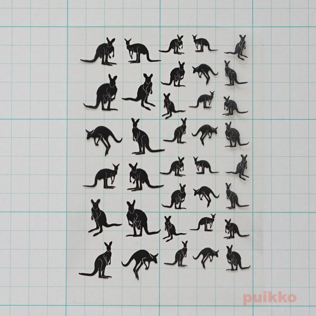 カンガルー(kangaroo)のシルエットイラストを使ったシートです。ジャンプしているカンガルー、おなかに赤ちゃんがいるカンガルーなど6種のイラストをサイズにバリエーションをつけて収録しました。